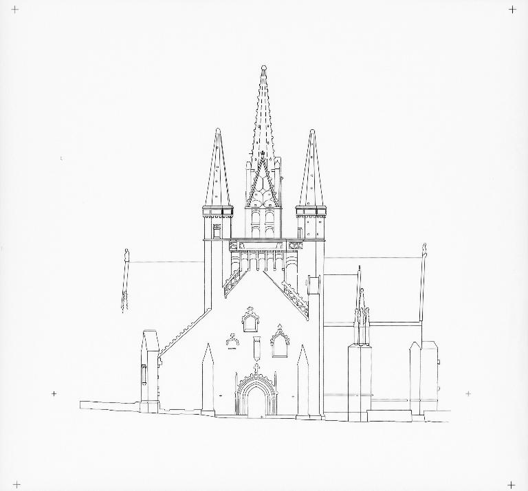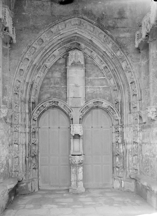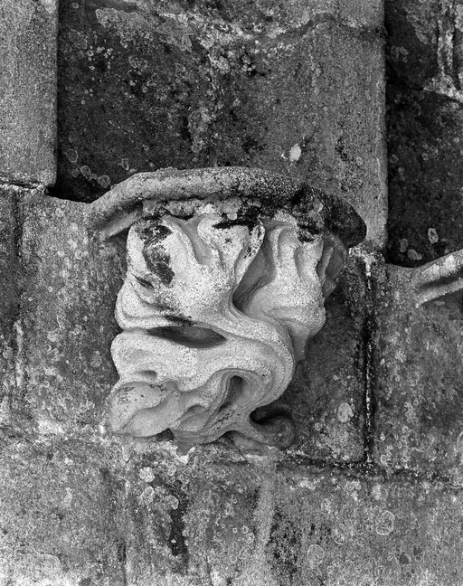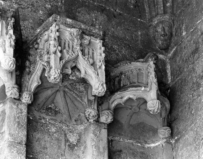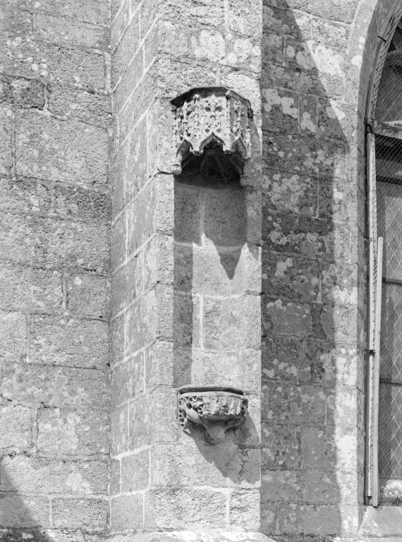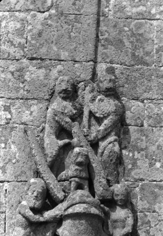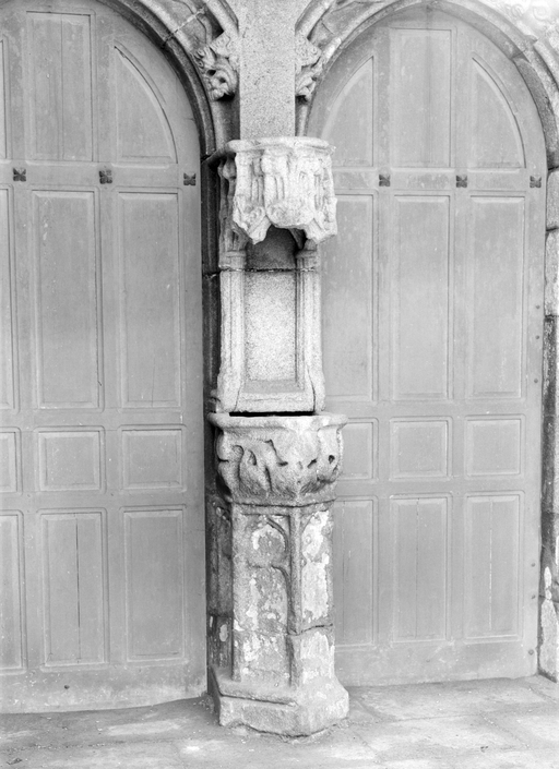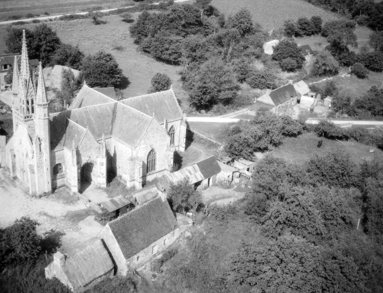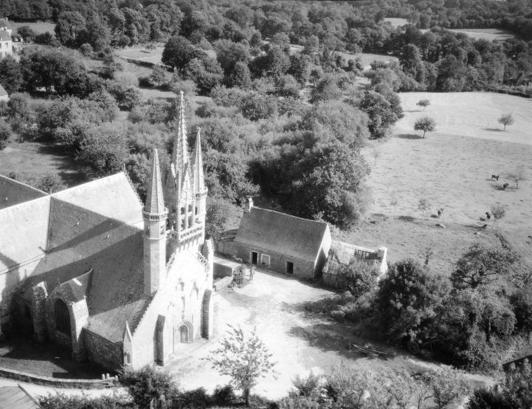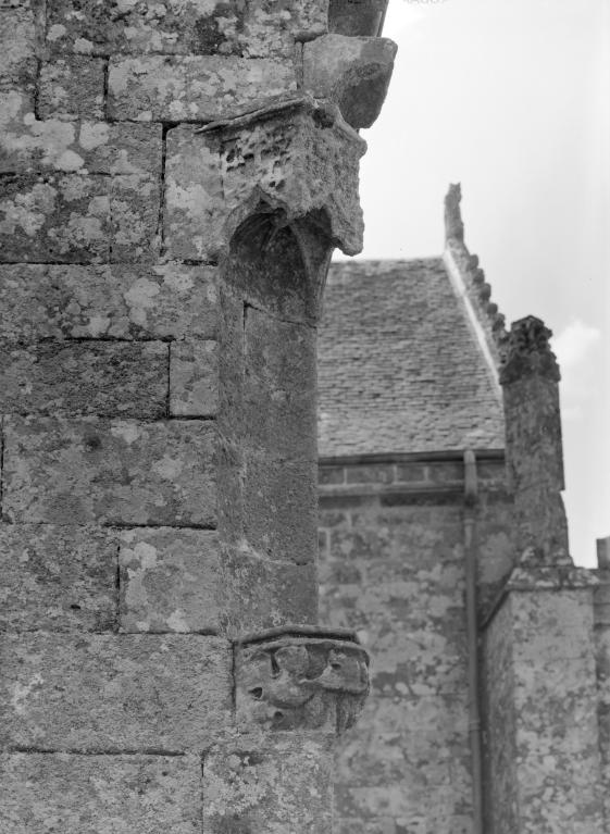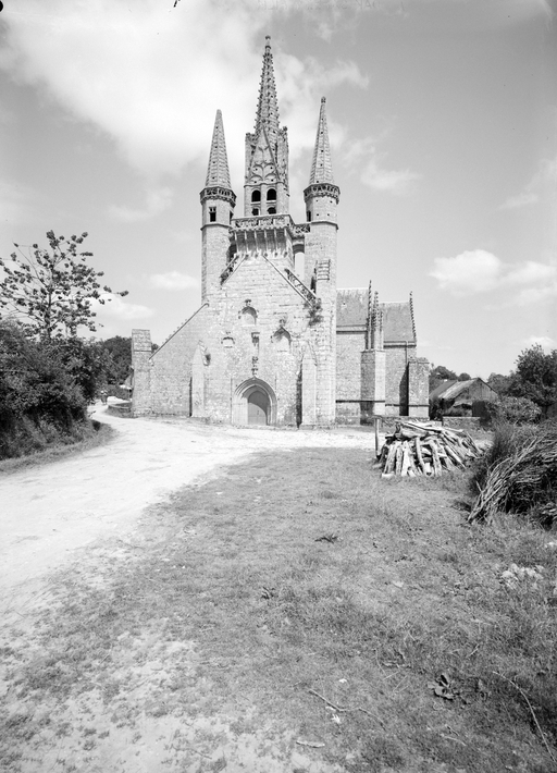 L´élévation sud présente une alternance d´avancées et de retraits de proportions variées qui, comme autant de temps forts et de temps faibles, rythment la composition, et frappe par son unité de style que renforce l´emploi de contreforts ornés de niches à dais et dont le sommet en glacis à quatre pans, forme moderne massivement employée sur le chantier de Kernascléden, sert de socle à des pinacles aigus posés à 45°. Quelques légères différences entre le choeur et le bras sud suggèrent une évolution. Tandis que les consoles des contreforts du choeur sont ornées de feuilles refouillées, celles du bras sud sont sculptées de personnages grotesques jouant avec des chiens, mais surtout la petite porte qui donne accès directement dans le choeur présente encore de grêles colonnettes à peine perceptibles comportant bases prismatiques en flacon et minuscules chapiteaux, modèle sans doute repris des transepts de Quimperlé, alors que celle qui est murée dans le mur ouest du bras sud, dont l´arc externe anguleux vient se fondre dans les piédroits sans chapiteau et les pinacles latéraux atteignent la hauteur du fleuron sommital, témoigne d´une évolution stylistique indéniable semblable à celle constatée sur le porche sud. Enfin, au-dessus de la petite porte du choeur, la superposition d´une niche à dais et d´une rose, percée pour l´élégance du motif, distinguent l'accès réservé au clergé et au seigneur supérieur. Le porche sud par l´association de grandes plages unies et de parties sculptées très localisées résume à lui seul l´économie esthétique de l´édifice. Il est encadré par deux larges et puissants contreforts angulaires qui semblent indiquer l´entrée, équilibrent la masse du pignon uni et lui confèrent une dimension monumentale. Ces contreforts sont ornés sur leurs faces latérales, de part et d´autre de l´entrée, de niches à dais semblables à celles qui ornent les autres contreforts de la chapelle et couronnés d´un faisceau de pinacles de section cylindrique dont le modèle est directement emprunté au chevet de Kernascléden. Sur ce frontispice presque dépouillé, le lambrequin à arcs trilobés et accolade ornée de feuilles retournées qui souligne l´ouverture du porche prend toute sa valeur. À l´image de l´ensemble du décor de la chapelle, l´intérieur du porche illustre ce goût pour une certaine épuration stylistique qui vise à l´efficacité. Les deux séries de niches prévues pour recevoir les statues des apôtres reprennent en continu le principe de celles des contreforts qui se résume à un simple enfoncement dans le mur dépourvu de toutes colonnettes ou moulures. Cette conception épurée, adaptée aux proportions du porche, vise également à valoriser le portail lui-même, principal accès à l´intérieur de la chapelle. Ce dernier - une grande arcade en tiers-point incluant deux portes géminées de forme et de décor semblables, sous un tympan plein devant lequel devait s´inscrire une statue de trumeau - est une transposition trait pour trait, et de dimensions identiques, de celui du chœur de Kernascléden. La même savante économie se retrouve dans la sculpture du porche dont Léon de Groër fait remarquer le style particulier. Les socles des niches, au lieu d´être sculptés de figures ou de feuillages retournés et refouillés comme sur le chœur, sont ici ornés d´une unique et large feuille souple qui semble comme plaquée par le vent : ce trait, accentué sur les contreforts de l´entrée, révèle une évolution qui se démarque nettement de l´ornementation recherchée et précieuse, presque méticuleuse, rencontrée à Kernascléden. Là encore et comme pour la composition de la façade, loin d'être due seulement à une différence dans le budget du chantier, il s´agit bien d´une recherche de style.