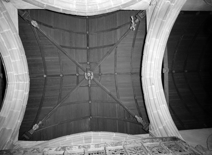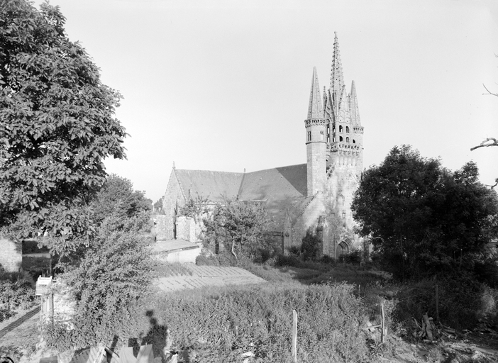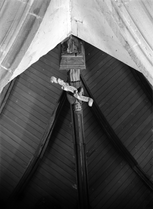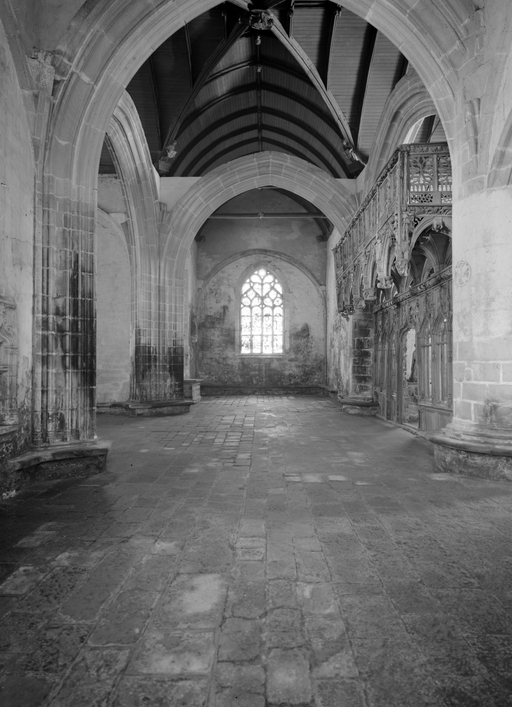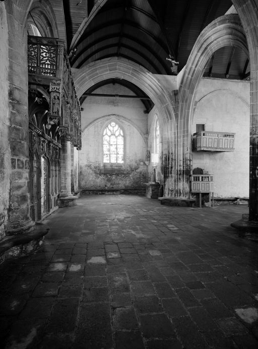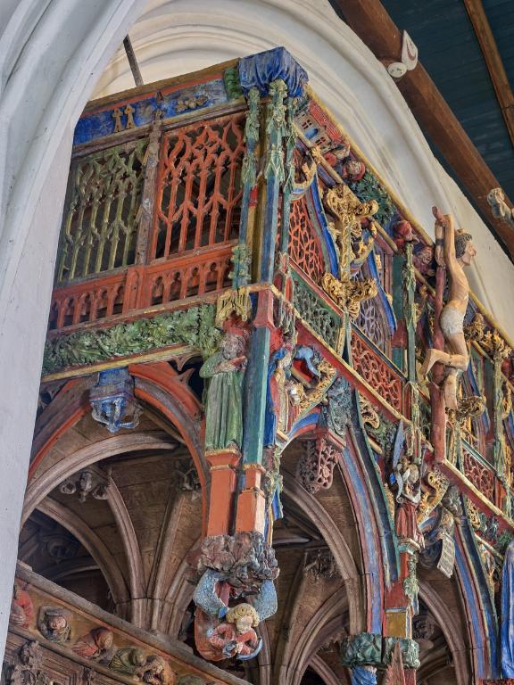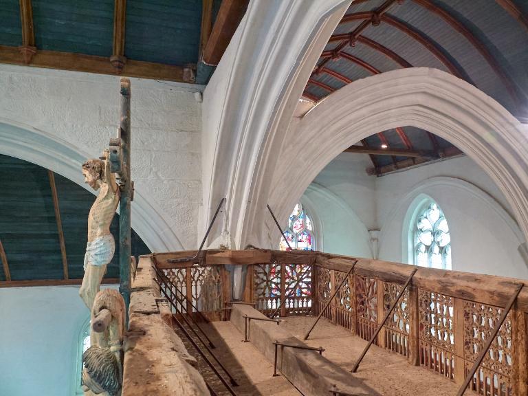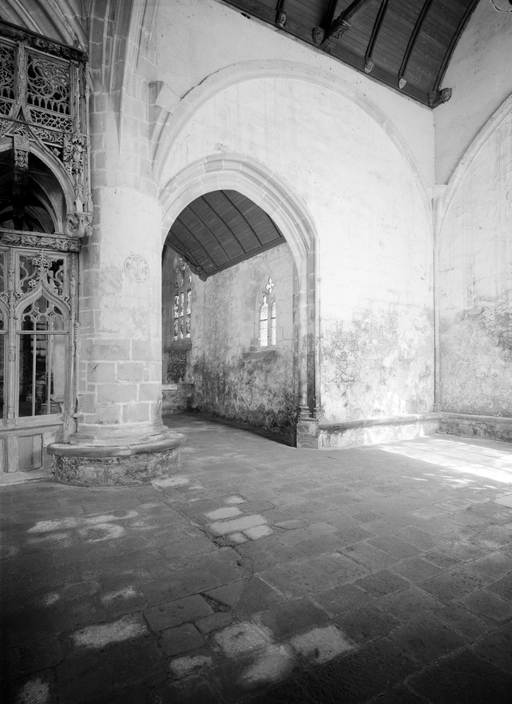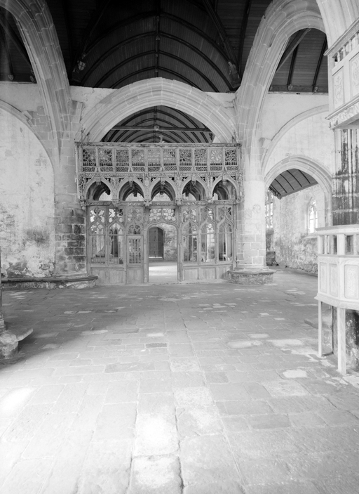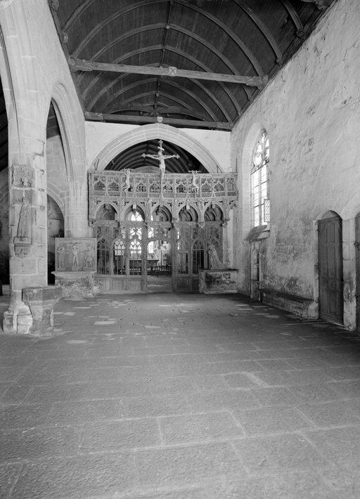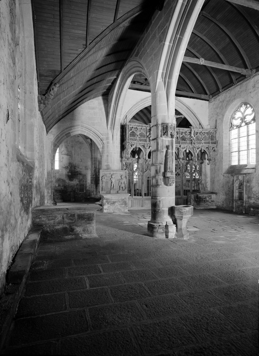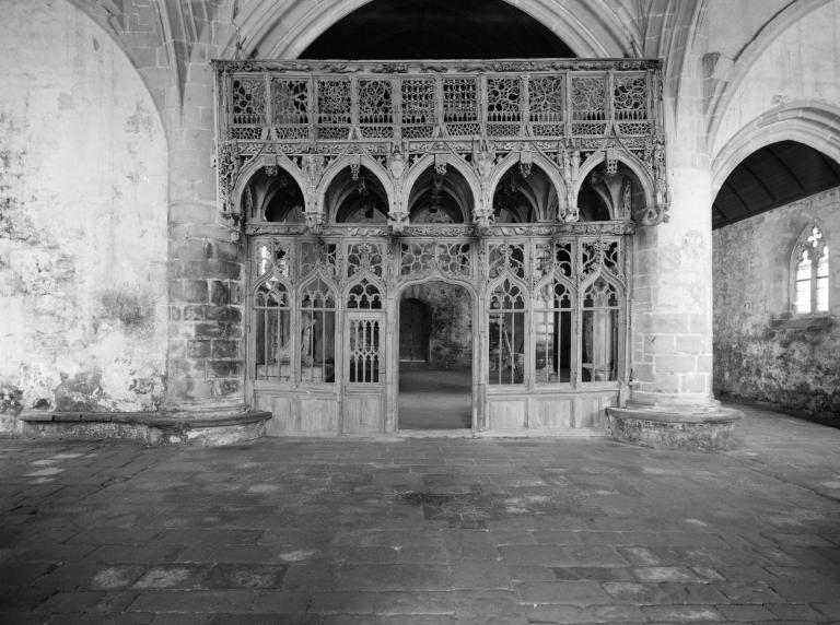 L´étourdissant jubé de 1480, dont la sculpture atteint des sommets de virtuosité, s´inscrit dans la même démarche. Bien qu´il s'agisse d´un ouvrage de menuiserie, ce dernier joue un rôle majeur dans la répartition et la distribution des espaces au point que la question de son emplacement mérite d´être évoquée. A l´entrée du chœur, au Nord, du côté de l´évangile, deux portes du XVe siècle presque superposées qui donnent aujourd´hui l´une sur une chaire à prêcher et l´autre sur une tribune seigneuriale, datables du XVIIe siècle, ouvrent sur un escalier en vis en pierre ménagé dans la pile et dont la cage cylindrique déborde à l´extérieur à l´aisselle du chœur et du bras nord. Il est plus que probable que cet escalier, solidaire du gros-œuvre du XVe siècle, avait été prévu pour desservir la tribune d'un jubé selon une formule que l´on trouvait à Notre-Dame-de-la-Cour à Lantic, à Notre-Dame de Quilinen ou encore à l´église de Locronan. D'autres indices suggèrent que l'emplacement actuel du jubé résulte d'un changement de parti en cours de chantier comme l'indique son montant principal du côté nord qui vient se coller de façon maladroite et inesthétique au milieu de la niche crédence de l´autel de Saint-Sébastien, aménagée dans la pile nord et dont on a brutalement entaillé l´appui. En même temps l'existence du coté de la nef au niveau de la tribune, à son extrémité sud d'une demi-travée destine à racheter la dissymétrie de plan, indubitablement solidaire du reste, montre que le jubé a bien été in fine conçu pour son emplacement actuel et non pour être installé à l'entrée du chœur comme il avait été initialement prévu.
