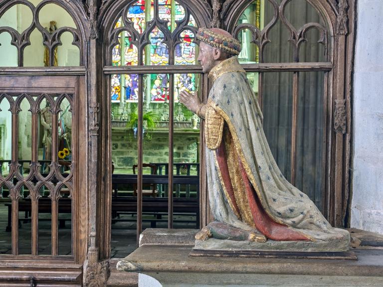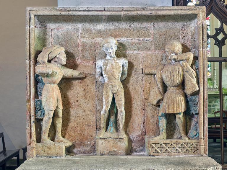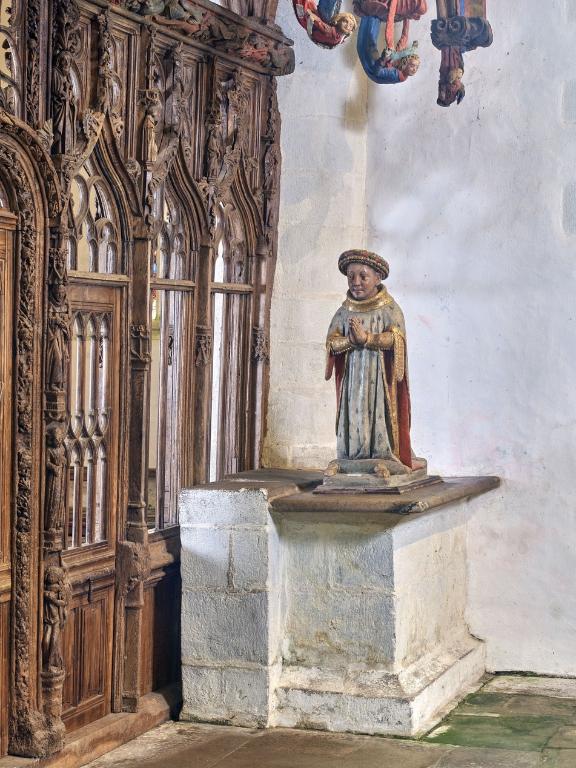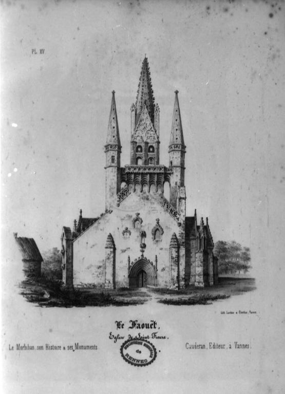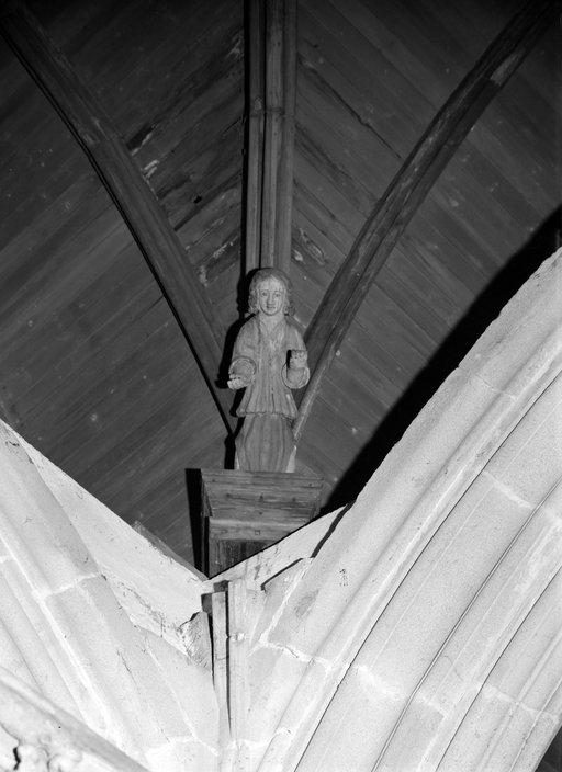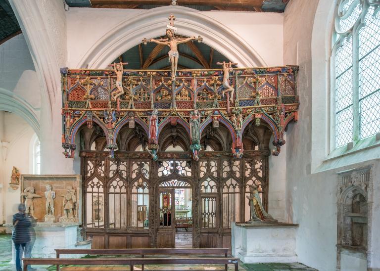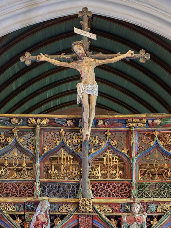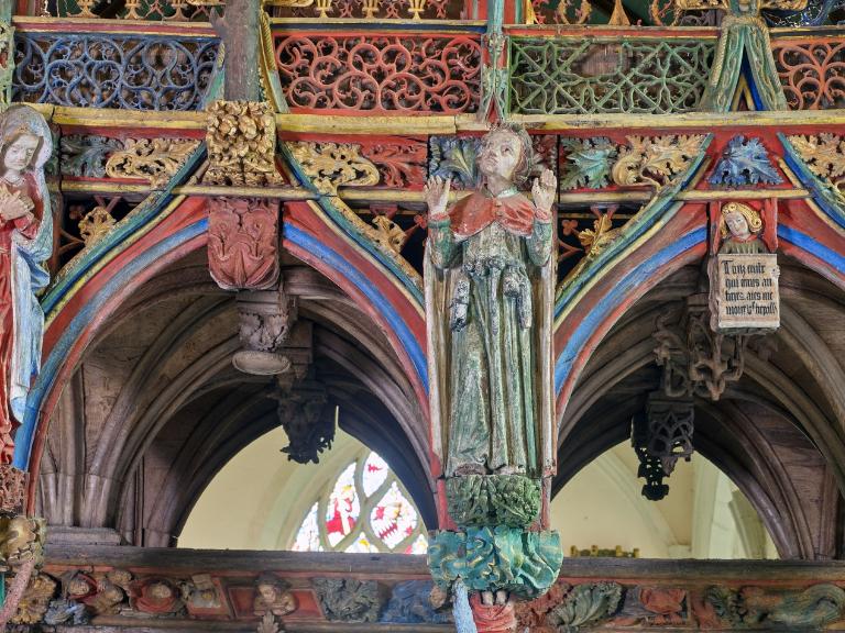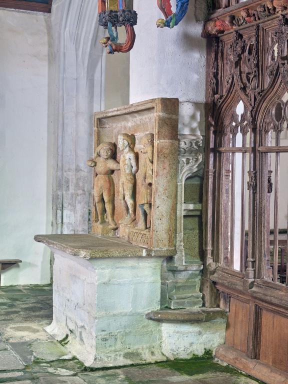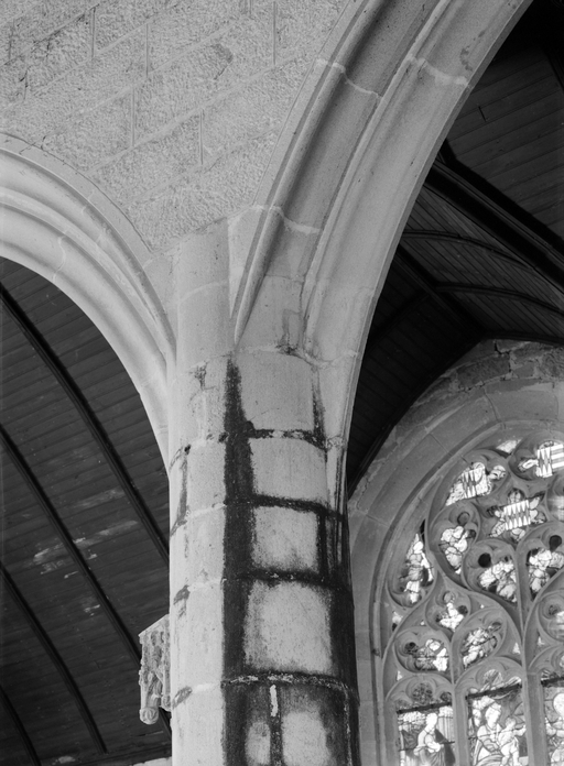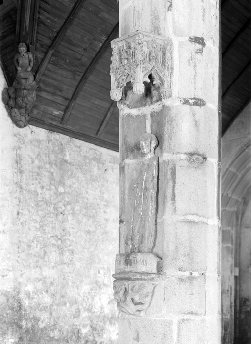 L´étourdissant jubé de 1480, dont la sculpture atteint des sommets de virtuosité, s´inscrit dans la même démarche. Bien qu´il s'agisse d´un ouvrage de menuiserie, ce dernier joue un rôle majeur dans la répartition et la distribution des espaces au point que la question de son emplacement mérite d´être évoquée. A l´entrée du chœur, au Nord, du côté de l´évangile, deux portes du XVe siècle presque superposées qui donnent aujourd´hui l´une sur une chaire à prêcher et l´autre sur une tribune seigneuriale, datables du XVIIe siècle, ouvrent sur un escalier en vis en pierre ménagé dans la pile et dont la cage cylindrique déborde à l´extérieur à l´aisselle du chœur et du bras nord. Il est plus que probable que cet escalier, solidaire du gros-œuvre du XVe siècle, avait été prévu pour desservir la tribune d'un jubé selon une formule que l´on trouvait à Notre-Dame-de-la-Cour à Lantic, à Notre-Dame de Quilinen ou encore à l´église de Locronan. D'autres indices suggèrent que l'emplacement actuel du jubé résulte d'un changement de parti en cours de chantier comme l'indique son montant principal du côté nord qui vient se coller de façon maladroite et inesthétique au milieu de la niche crédence de l´autel de Saint-Sébastien, aménagée dans la pile nord et dont on a brutalement entaillé l´appui. En même temps l'existence du coté de la nef au niveau de la tribune, à son extrémité sud d'une demi-travée destine à racheter la dissymétrie de plan, indubitablement solidaire du reste, montre que le jubé a bien été in fine conçu pour son emplacement actuel et non pour être installé à l'entrée du chœur comme il avait été initialement prévu.