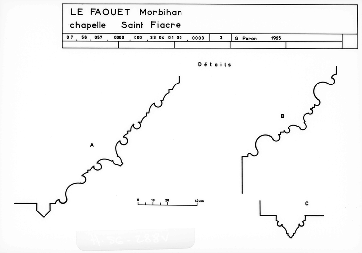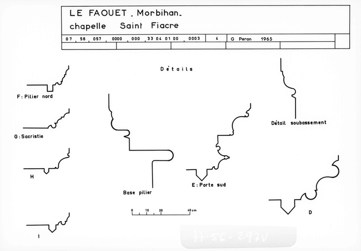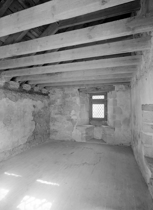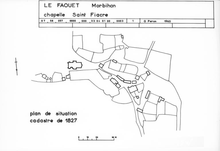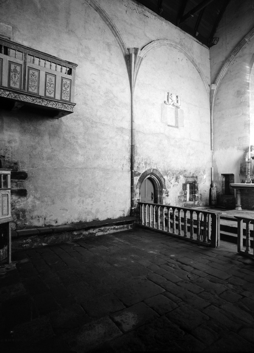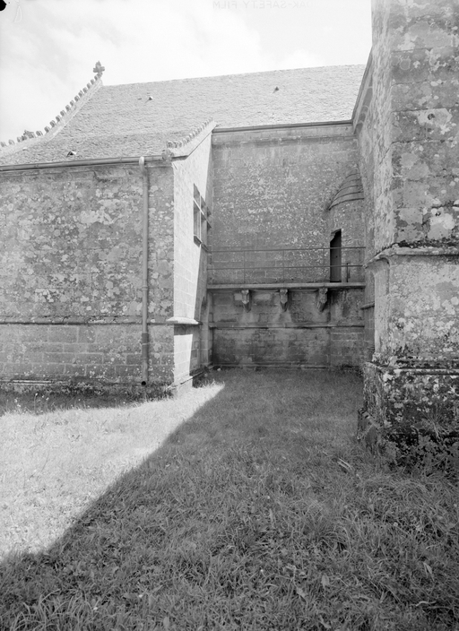 Dans le mur nord du choeur, une porte ouvre sur une petite pièce dont la fonction récente de sacristie n´est certainement pas d´origine : cet espace comporte un petit autel, une crédence ainsi qu´une fenêtre basse que son appui presque au ras du sol signale comme un guichet destiné à recevoir la communion agenouillé, dispositions qui permettent d'y reconnaître un oratoire seigneurial. L´escalier qui mène à la pièce de l´étage est moderne et il est difficile de savoir l´emplacement et la forme de celui d´origine, si toutefois il en existait un. À l´étage, une fenêtre à coussièges* ouverte dans le pignon est, une cheminée dans le mur gouttereau nord et enfin, dans le mur surplombant le chœur, une baie actuellement murée qui formait hagioscope*, portant encore sur son linteau les armes des Boutteville, indiquent un autre oratoire seigneurial. Des photographies prises lors de l´enquête de l´Inventaire en 1966 montrent, entre l´oratoire de l´étage et la vis d´escalier, contre le mur nord du chœur, une coursière extérieure en dalles de granite sur corbeaux moulurés. Cette disposition, qui avait sans doute été assez fortement restaurée lors du remontage du mur ouest de la sacristie en 1911, présentait toutefois le grand intérêt de conserver la distribution ancienne de l´étage de l´oratoire. La présence d´un système de coursière semblable sur la façade principale du logis du château du Saint, résidence habituelle de la famille de Boutteville, aujourd´hui détruite, confirmerait l´authenticité du dispositif disparu de Saint-Fiacre.