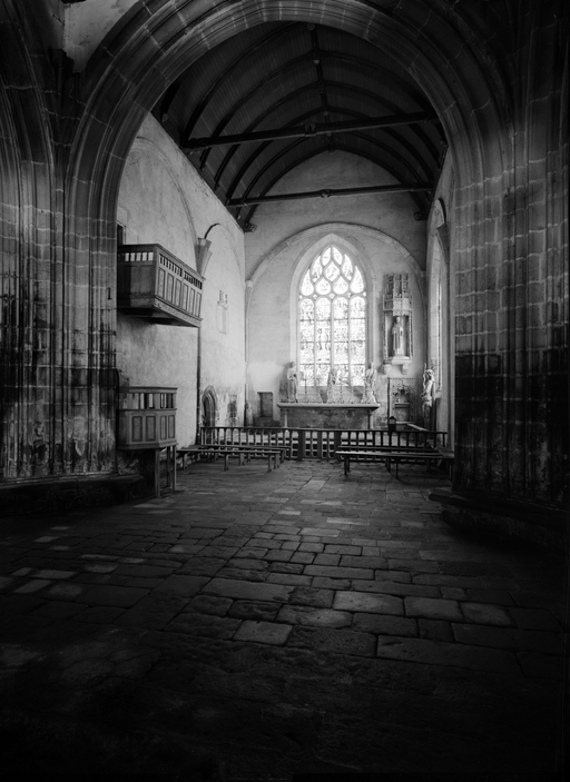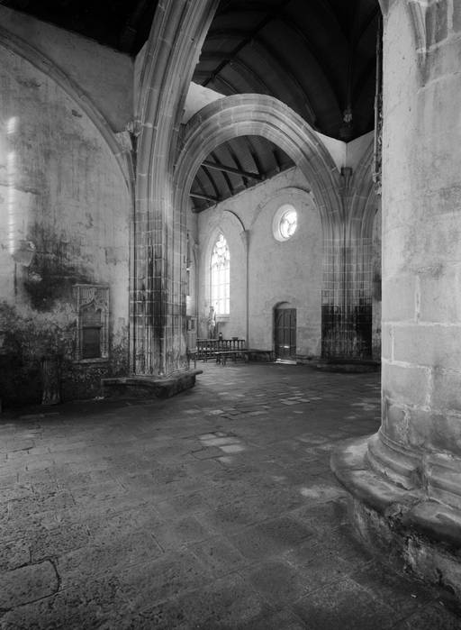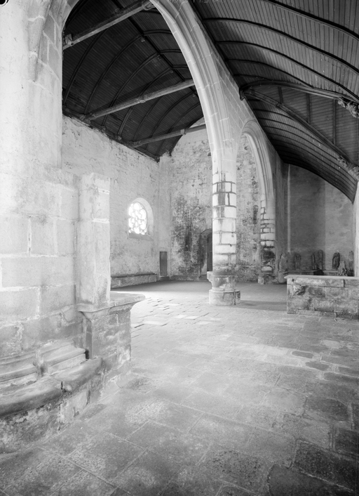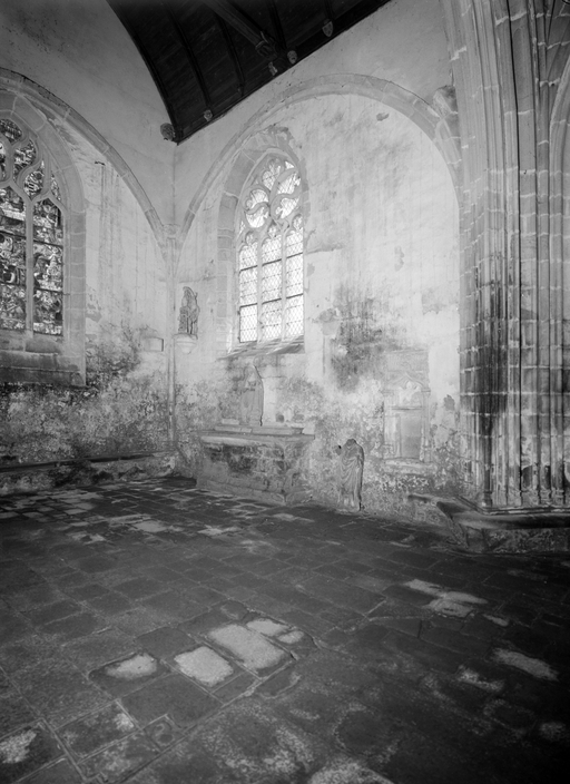 Outre les bases des piles marquant l´entrée du chœur, dont les savantes interpénétrations rappellent celles de Kernascléden, le décor intérieur de la chapelle se résume surtout aux cinq crédences desservant les différents autels, aux culots sculptés de larges feuilles ou de têtes humaines caricaturales destinés à supporter les statues. Les baies de la nef au nord comme au sud et celles des faces orientales des bras de transept ont conservé leur réseau du XVe siècle, essentiellement composé de mouchettes à redents trilobés, disposées tête-bêche ou en bouquets. La grande fenêtre passante du collatéral nord dont le remplage originel a été respecté lors de la réfection de sa verrière en 1550 est une composition élégante dont le dessin, sans surcharge ni raideur, peut donner une idée des réseaux d´origine de la maîtresse-vitre et des baies nord et sud du transept, remplacés au XVIe siècle. Cette décoration épurée n´est pas due seulement au moindre rang de la chapelle : elle reflète aussi une nouvelle conception esthétique de l´espace intérieur qui apparaît en Bretagne vers le milieu du XVe siècle et cherche, sur des surfaces de murs laissées nues, à valoriser les baies et leurs vitraux ainsi que le mobilier. L´ensemble remarquable de verrières des XVe et XVIe siècles encore conservé dans la chapelle, la statuaire et surtout le jubé, permettent d´apprécier pleinement cette recherche esthétique.