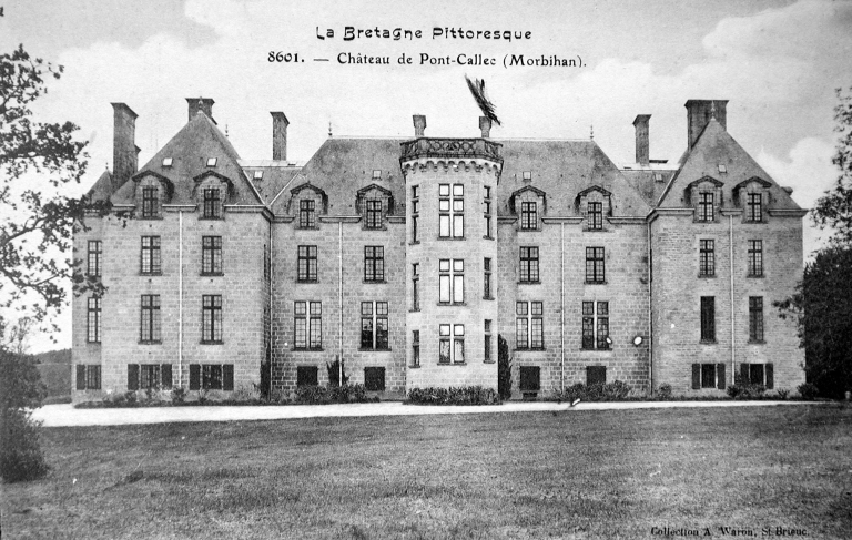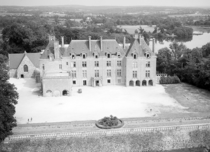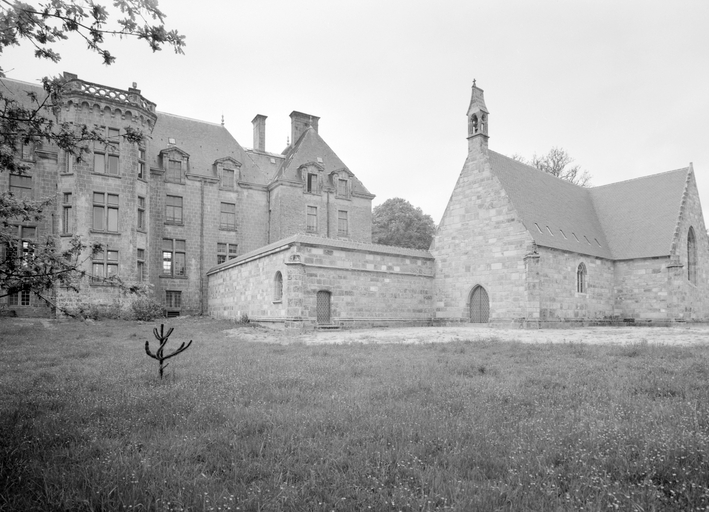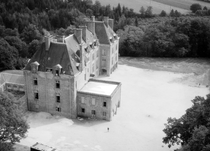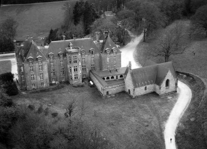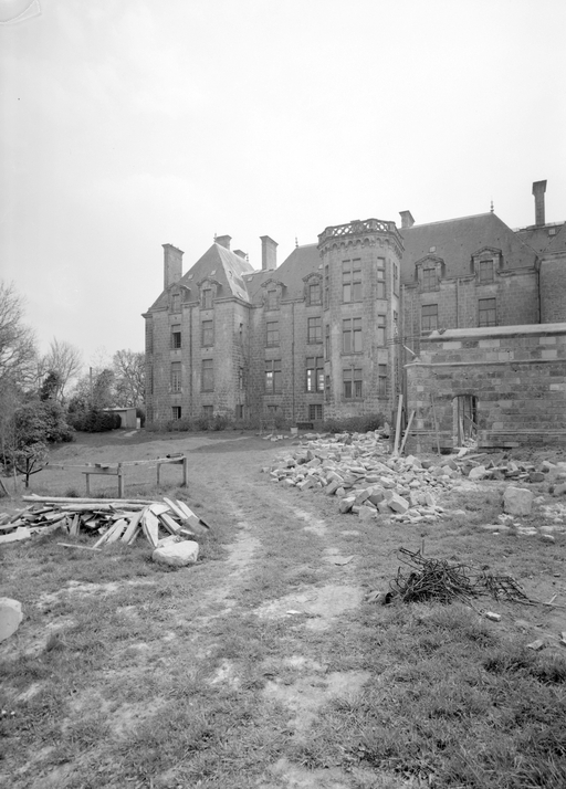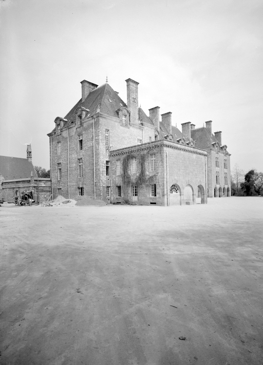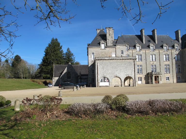 Le château actuel, l'aile occidentale exceptée, est une reconstruction de 1882, due au fils du Comte de Brissac qui avait racheté le château en 1833. Deux constructions antérieures au moins se sont succédées sur une ancienne place forte, siège d'une importance seigneurie, et partiellement détruite par les troupes de Mercoeur en 1591. Si cette enceinte a subsisté jusqu'à une date avancée, il est généralement admis que le logis a été reconstruit au 17e siècle, comme en témoigne le pavillon ouest. Cet important ensemble a été presque entièremenet brûlé en 1796. Au cours des travaux du 19e siècle, la majeure partie du pavillon occidental, flanqué de la tourelle carrée au sud-est, a été conservée, les parties hautes, lucarnes comprises, ont été refaites. En même temps, un bâtiment cubique à deux niveaux a été ajouté en avant du pavillon ouest. Vendu autour de 1956 à une communauté de Dominicaines qui y dirige un orphelinat, l'ensemble a été augmenté en 1966 par une chapelle et un cloître, la chapelle remployant des matériaux de la chapelle Sainte-Anne de Pluméliau. (E. Laurenceau)