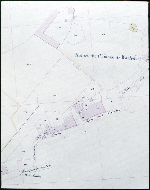 Édifié sur un éperon rocheux qui domine la ville et la vallée du Gueuzon, le premier château était l’œuvre des seigneurs de Rochefort apparus au 12e siècle. Tenu à partir de 1374 par les Rieux, l'une des plus puissantes familles de la Bretagne ducale, le château de Rochefort présente un plan allongé. En partie rasé en 1488 sur l'ordre du roi Charles VIII, sa reconstruction est entreprise vers 1490 par Jean IV de Rieux. C'est de cette période que datent le châtelet et la tour sud. Pris et brûlé par les partisans de Mercœur au moment des guerres de la Ligue, il est partiellement reconstruit pendant la 2e moitié 17e siècle pour les Larlan. Détruit presque totalement en 1793, le château fut acquis en 1907 par le peintre américain Alfred Klots qui transforma les anciens communs en manoir néo-gothique avec des matériaux de remploi provenant en particulier du manoir de Kéralio en Noyal-Muzillac (la chapelle est remontée en 1917). En 1978, la propriété est acquise par le département.