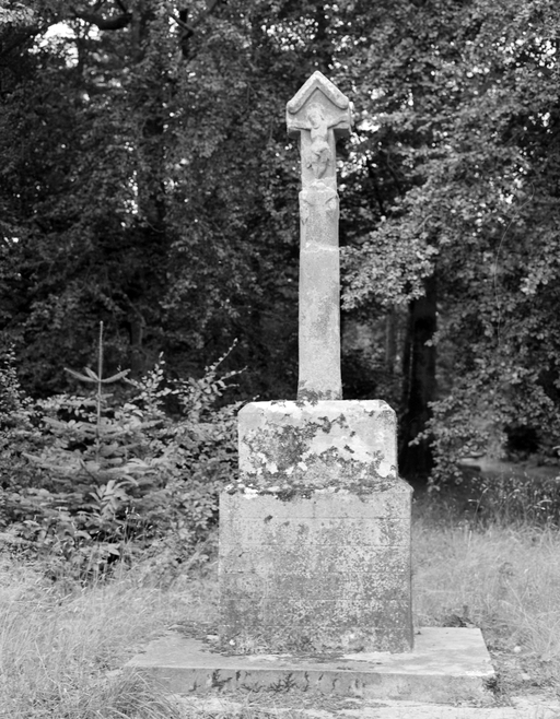 Croix à bâtière sur socle et soubassement de maçonnerie. Décor en demi-relief ; sur une face : Christ en croix ; sur l'autre face : Vierge à l'Enfant couronnée.