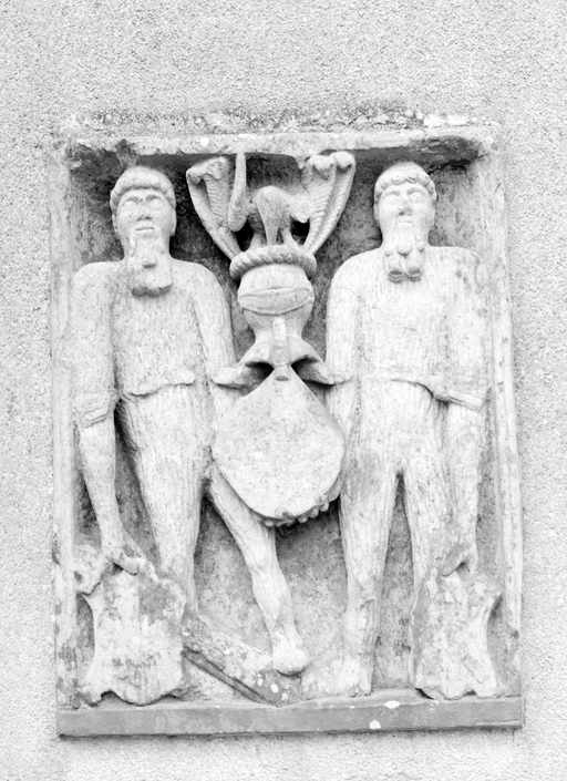 Blason martelé avec tenants humains ; blasons de Busnel, de Launay, de Larcher, de Lannivon.