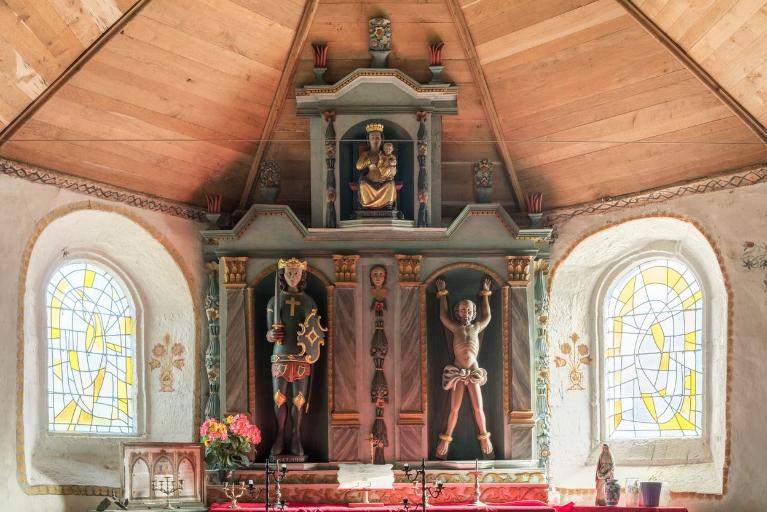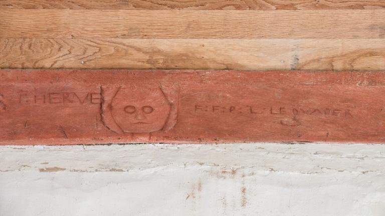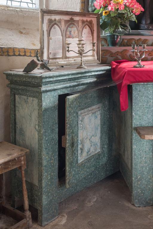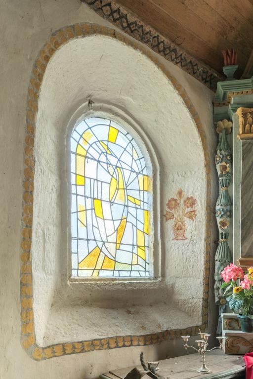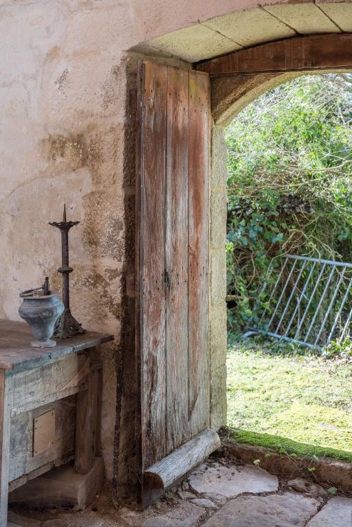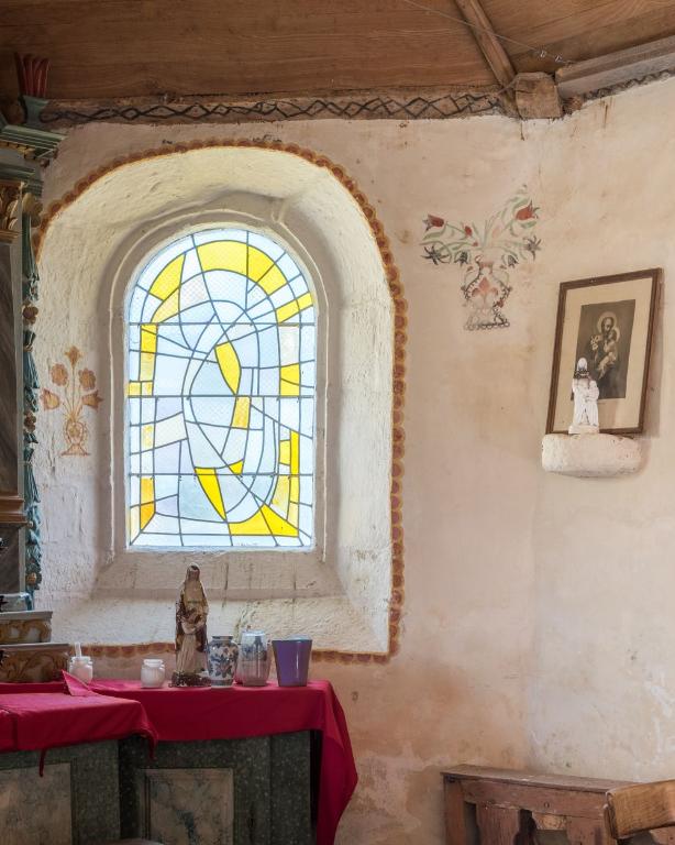A l'intérieur de la chapelle subsiste le sol en dalles de granit. Au fond de la nef, les bases en pierre des poteaux qui devaient soutenir une tribune seigneuriale ont été conservées. Les sablières sont ornées de visages frustes et portent des noms inscrits ainsi que la date "1630". Les blochets à l'entrée du chœur ont également reçu un décor de mascarons. Des motifs peints de fleurs dans des vases, découverts lors de la dernière restauration (1990), habillent les ébrasements des baies du chœur.