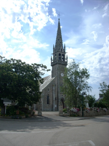 Edifice construit en 1900 au sud du village ancien après la démolition de l' ancienne église paroissiale au vieux bourg ; Ernest le Guerranic, architecte de Saint-Brieuc, assure le chantier ; presbytère construit vers 1906 ; figures d' un calvaire 18e siècle remontées sur un fût daté 1906.