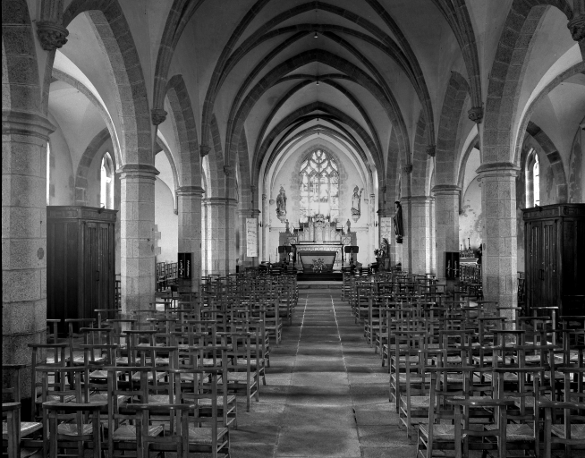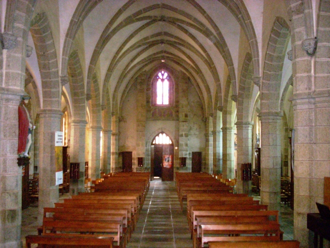 Eglise voûtée en briques creusés. Plan en croix latine à trois vaisseaux. Chevet plat flanqué de deux sacristies dans-œuvre. Clocher à une galerie et à un étage de cloches amorti d´une flèche octogonale ajourée ornée de crossettes et encadrée à sa base par quatre gables ajourés et quatre pinacles. Gros œuvre en moellon équarri de granite, à l´exception des encadrements de baies et des chaînages d´angle, en pierre de taille de granite. Nef à cinq travées couverte d´une voûte à croisée d´ogives, bas côtés voûtés de fausses voûtes d´arêtes. Arcades en arc brisé reposant sur les chapiteaux des piliers octogonaux. Sol couvert de dalles de granite.