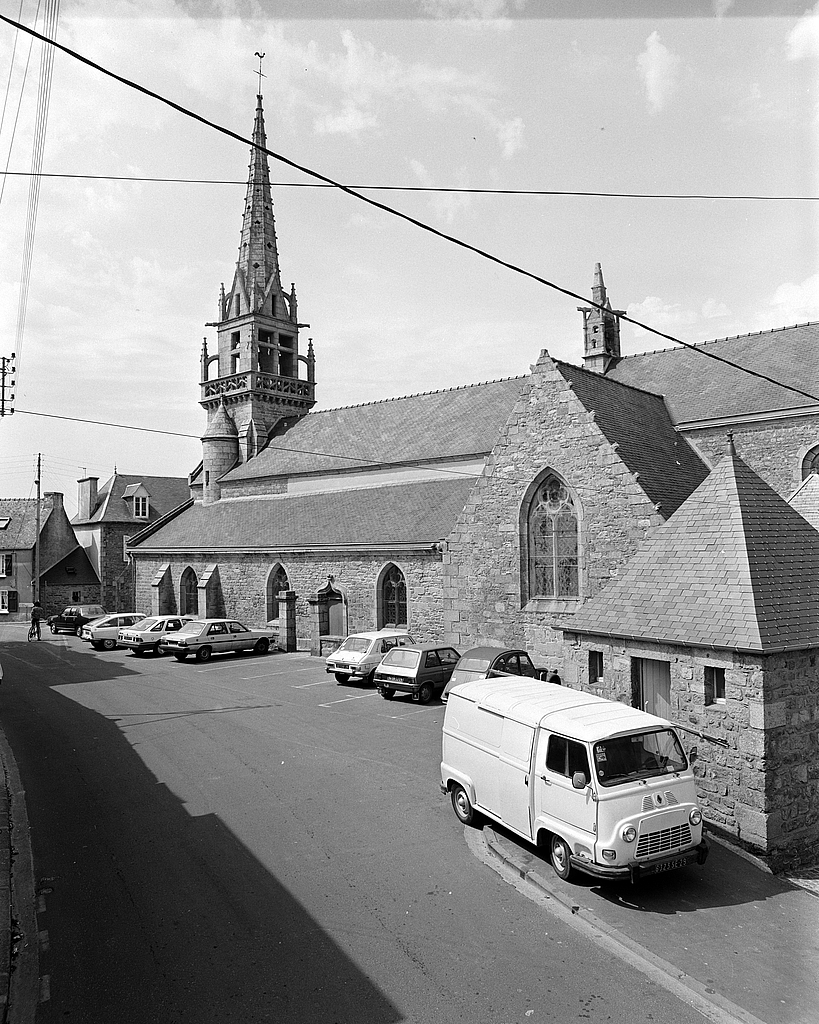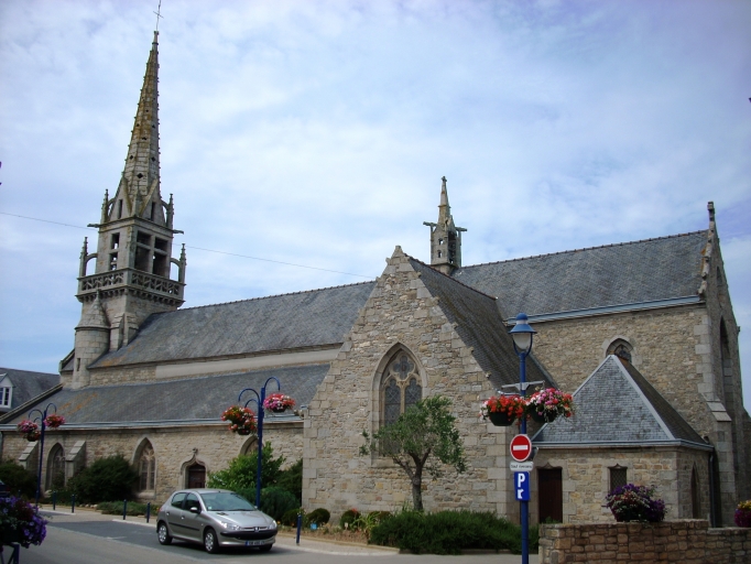 Ancienne église tréviale dépendante de Saint-Pol-de-Léon du 16e siècle détruite. Eglise actuelle construite entre 1851 et 1855 d'après les plans de l'archéologue et héraldiste Pol Potier de Courcy. Le clocher porte les dates de 1893, 1894, 1895 à sa base. Remplois d'éléments provenant de l'ancienne église.