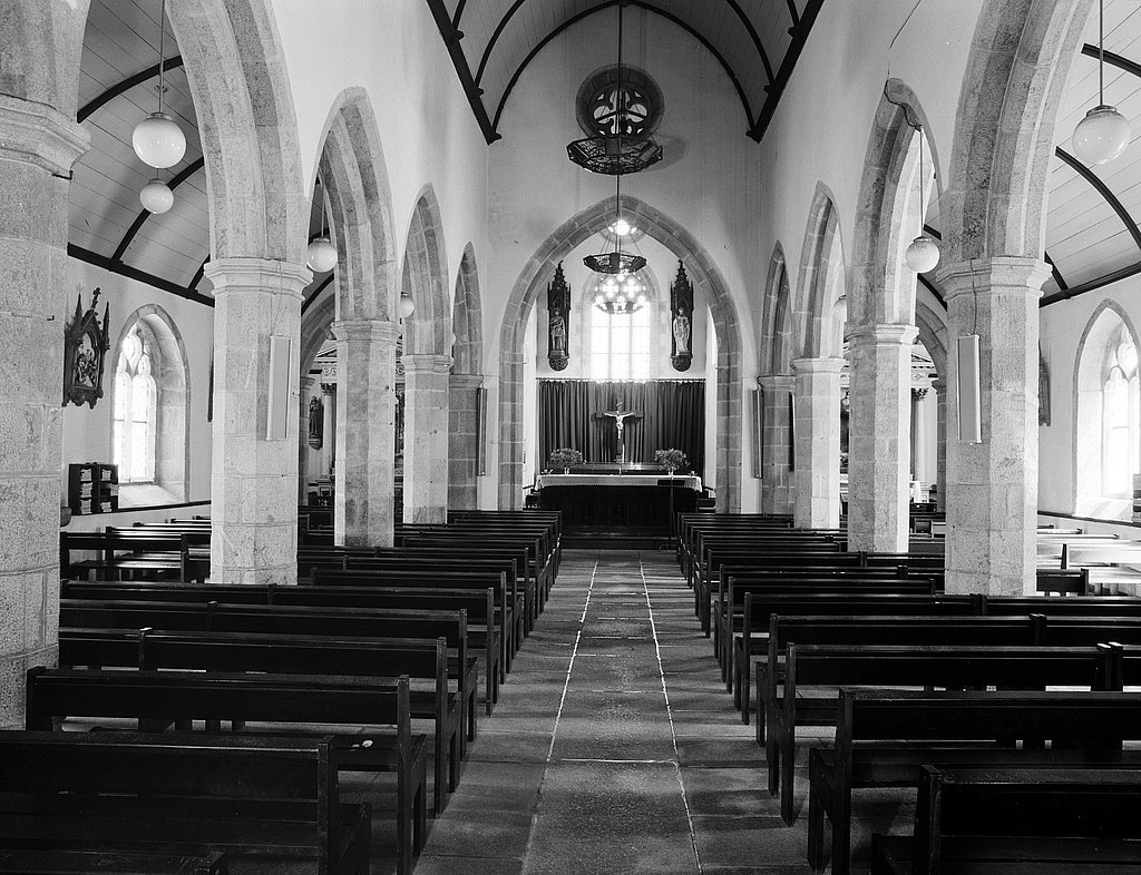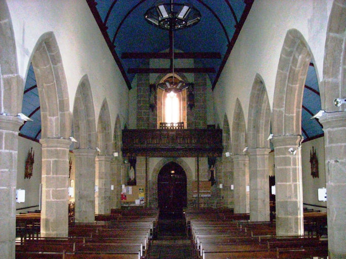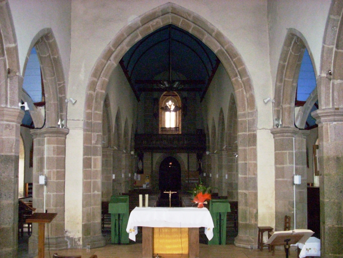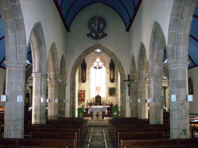 Plan en croix latine à trois vaisseaux. Chevet plat flanqué au sud d´une sacristie hors-œuvre de plan carré. Clocher à une galerie et à une chambre de cloches ajourée amortie d´une flèche octogonale ajourée ornée de crossette et encadrée à sa base par quatre gables ajourés et quatre pinacles. Clocheton à la croisée du transept. Gros œuvre en moellon de granite enduit, à l´exception des encadrements des baies et des chaînages d´angle. Nef à six travées couverte d´un lambris de couvrement. Arcades en arc brisé reposant sur les chapiteaux des piliers octogonaux. Chœur séparé de la nef par un arc diaphragme et accosté de deux chapelles latérales ouvertes sur le faux transept. Deux chapelles latérales au niveau de la cinquième et sixième travée formant faux transept. Sol couvert de dalles de granite.