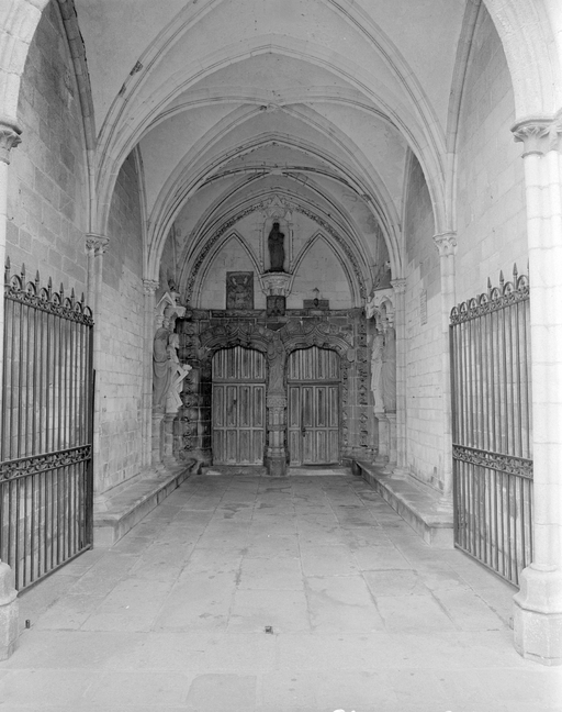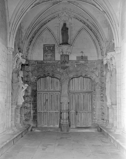 La tour sud communique directement avec l’extérieur à l’ouest, par une petite porte en tiers point du XIIIe siècle, qui passe localement pour avoir été réservée aux lépreux. Le porche sud fut construit dans la foulée de l'édification de la nef. Il semble que ses trois travées aient été destinées à abriter les statues du collège des apôtres. En fait, il ne reste plus guère du XIIIe siècle que la masse un peu lourde du porche, les voûtes et le tympan en calcaire de Caen ainsi que quatre dais de statues. Une importante reprise en sous-œuvre du portail fut réalisée en kersantite au cours de la première moitié du XVe siècle. Pol de Courcy a reconnu au-dessus de la porte de gauche les armes de Jean Validire évêque de1427 à 1432, le style des bases encre proche des modèles du XIVe siècle corrobore cette attribution. Une polychromie devait alors gommer la différence entre les deux matériaux.