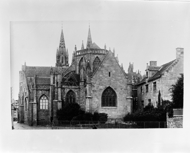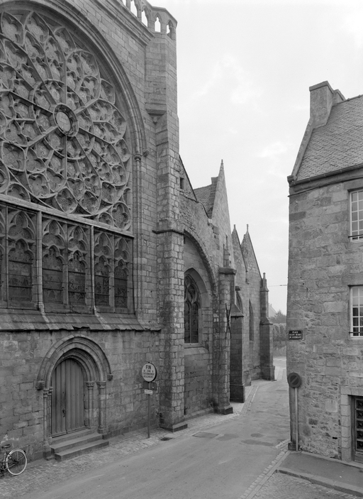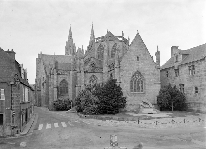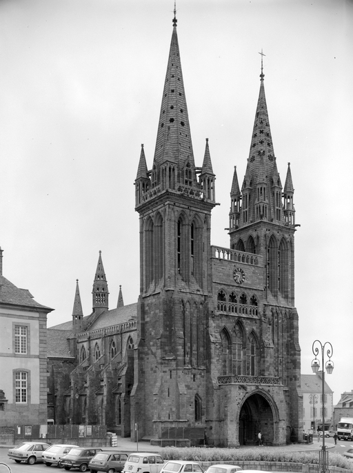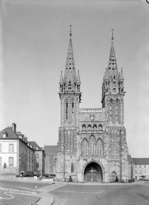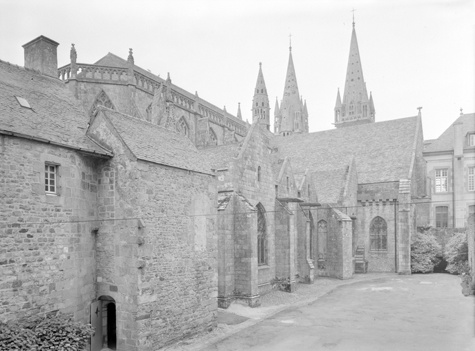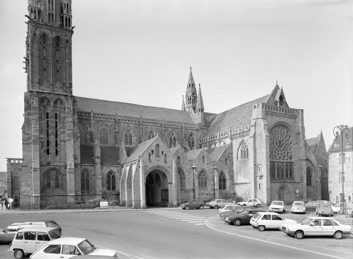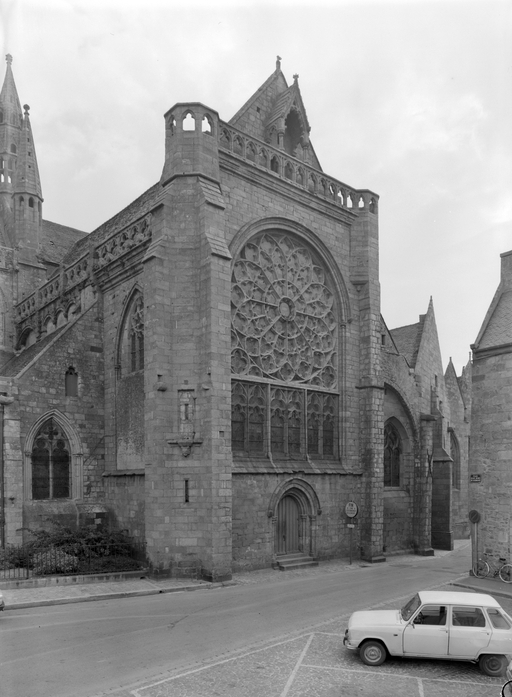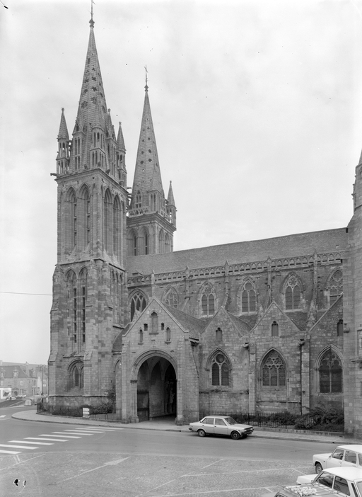 Transept de style roman partiellement conservé datant du 12e siècle, construit sous l'evêque Hamon. Nef et massif occidental à deux tours d' inspiration normande fin 13e ou début 14e siècle. Reconstruction partielle du transept et achèvement du chœur sous les évêques Jean Prigent (1436-1439) et Guillaume Ferron (1439-1472). Modifications aile sud 2e moitié 16e siècle. Maison 16e siècle probablement ancienne chambre forte ou salle du chapitre, actuelle sacristie. Cimetière au sud détruit en 1773. Edifice majeur de l' architecture religieuse bretonne, influencé stylistiquement, comme Dol et Quimper par les créations normandes de la 1ère moitié du 13e siècle, mais aussi anglaises (Devon, Cornwall) puis celles du domaine royal français. Emploi inhabituel en Bretagne de la pierre calcaire de Caen acheminée par voie maritime jusqu' à Pempoul et Roscoff.