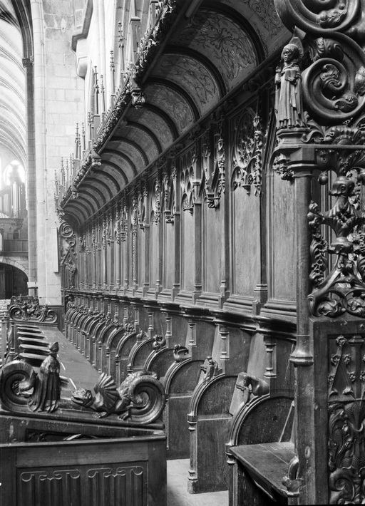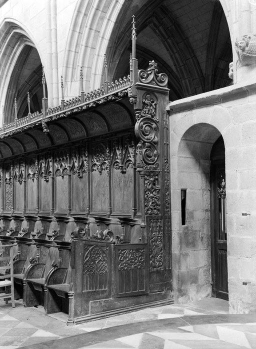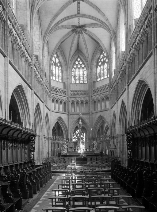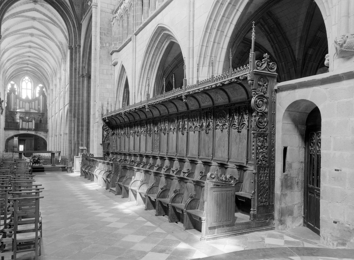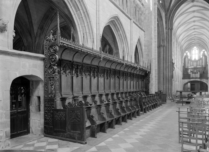 A la différence de la nef, le chœur de la cathédrale est édifié en granit et l’emploi du calcaire y est réservé à la frise richement sculptée qui surmonte le triforium. Les voûtes du chœur portent les armes des évêques Jean Validire et Jean Prigent, ce qui suppose une construction assez rapide du vaisseau central. Cette accélération du chantier est à mettre au compte du duc Jean V qui, dans un acte de 1431, concède “ 1200 livres à l’évêque de Léon pour l’aider à réédifier son église ”. Le plan du chœur de Saint-Pol est en lui-même remarquable : c’est un exemple unique en Bretagne de combinaison d’un déambulatoire avec rond-point et travées tournantes et d’un chevet plat à multiples redents. Ce plan est sans doute lié à une volonté de reprendre en partie les fondations de la cathédrale romane dont le sanctuaire était probablement terminé par un rond point. L’absence de toute fouille archéologique à l’intérieur de l’édifice ne permet pas de confirmer cette hypothèse toutefois plausible. L’examen du plan permet de constater que sa construction a commencé par le côté sud. De ce côté, en effet, le projet initial à deux déambulatoires d’égale largeur se maintient sur les trois premières travées, alors qu’il est abandonné du côté nord au-delà de la deuxième travée. Il semble que l’idée première d’un chœur à double déambulatoire, peut-être alors associé à des chapelles rayonnantes, plan semblable à celui de Tréguier, ait été abandonnée en cours de chantier au profit d’un plan différent comportant une extension en largeur du collatéral extérieur et l’adoption d’un chevet échelonné permettant d’y intégrer une chapelle d’axe consacrée à la Vierge. Là encore, l’influence des modèles anglais est sans doute pour beaucoup dans l’élaboration de ce plan atypique. Le vaisseau central accueille deux fonctions : le chœur canonial occupe les trois travées juste après la croisée, et le sanctuaire à proprement parler les deux travées droites restantes et celle en forme de trapèze qui termine le rond-point. Le quadrillage de l’élévation, déterminé par le croisement des retombées de voûtes et celui des bandeaux qui encadrent le triforium, s’inscrit dans la même logique rythmique que celle de la nef, dont il accentue les effets. A la différence du chœur de Tréguier, les piles des grandes arcades ne font ici aucune saillie du côté intérieur et tout incite à penser que l’on a édifié cette élévation en concevant d’emblée la clôture destinée à recevoir un ensemble de stalles à hauts dossiers. De ce fait, l'élévation des grandes arcades présente deux aspects différents : du côté intérieur, la mouluration des arcs rentre massivement dans les piles et les retombées des voûtes s’arrêtent au niveau de la naissance des arcs sur des culots figurés, tandis que du côté du déambulatoire des piles complexes réinterprètent, près de deux siècle plus tard, les formules mises en œuvre au XIIIe siècle dans la nef.