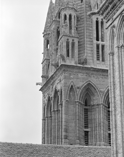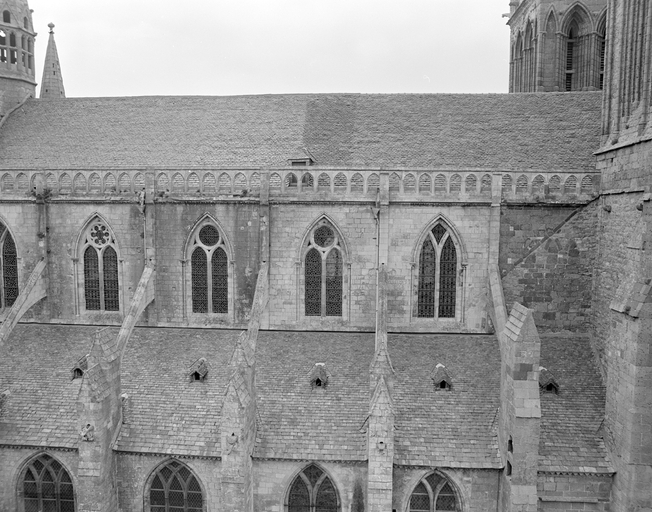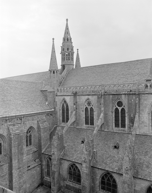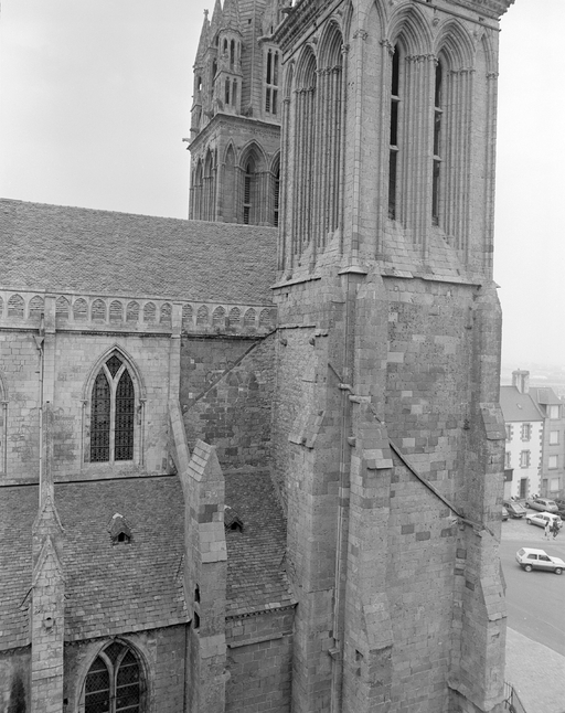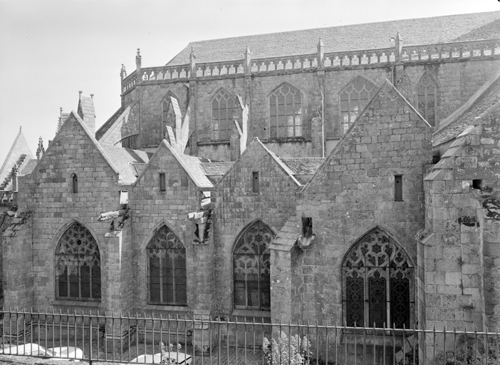 La disposition complexe du transept est le résultat de différents remaniements et changements de parti. Il semble que dans un premier temps on ait voulu conserver l’élévation des murs romans en la rhabillant au goût du jour. Cette configuration particulière explique en partie le clocher de la croisée construit vers1435 et dont les tourelles latérales contenant des vis maintiennent la circulation transversale au niveau des toitures. Sa composition reprend à la lettre celle du sommet du pignon de la façade ouest du Kreisker, édifiée autour de 1400, elle-même inspirée par de multiples exemples normands du XIIIe siècle comme Coutances, Lisieux ou Saint-Pierre-sur-Dives. Les choses sont plus complexes dans le bras sud où il apparaît que l’on a changé de parti en cours de reconstruction. Dans un premier temps, on s’est contenté de racheter par une suite d’arcs en surplomb au sommet du mur ouest les inégalités de l’ancien mur roman, et de réaliser un chemin de ronde. La volonté de créer une grande maîtresse vitre au sud a entraîné le décrochement en hauteur du pignon du bras sud, qui est sensiblement plus élevé que les murs gouttereaux. Cette élévation, visiblement inspirée de la façade occidentale du Kreisker, pourrait dater comme elle du dernier quart du XIVe siècle, ou des premières années du XVe. Elle est en tout cas certainement antérieure aux années 1420 si l'on considère les bases et les chapiteaux de la porte percée au bas du pignon et ceux de la grande baie elle-même. Elle a servi de modèle pour le pignon de la grande chapelle sud du Folgoët. Dans le pan coupé de l'angle sud-ouest qui contient l'escalier en vis menant au chemin de ronde, une porte haute murée dont le seuil en surplomb est supporté par un corbelet sculpté en tête humaine, devait correspondre à une chaire extérieure en bois, qui dominait au Moyen Âge l'ancien cimetière de la ville, alors au sud de la cathédrale. Il faut à ce propos balayer une tradition tenace autant que fantaisiste qui veut voir dans le dais au sommet du pignon un « balcon d'excommunication ». Ce motif essentiellement ornemental, emprunté aux niches à gâbles des flèches normandes, se retrouve au pied de la tour du Kreisker, au-dessus du pignon du bras nord, ainsi que sur le pignon de la grande chapelle du Folgoët. Les deux chapelles qui joignent sur un tracé oblique le bras sud et le chevet résultent d'un “ bricolage ” réalisé dans le courant du XVIe siècle pour augmenter l'espace intérieur du chœur et répondre à la demande de la noblesse léonarde, soucieuse d'y maintenir ses chapelles privatives et ses sépultures.
