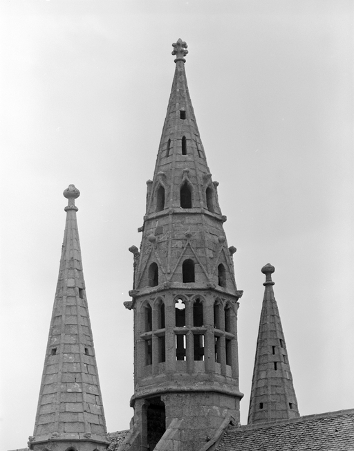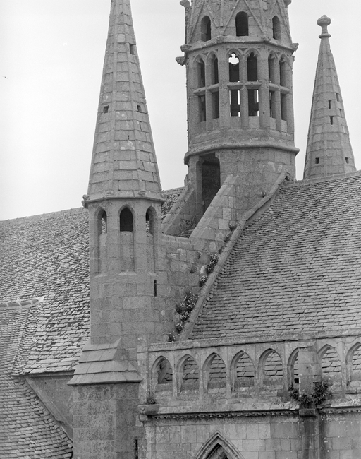La croisée est très précisément datée puisque sa clef de voûte porte les armes de Jean Prigent, chancelier de Bretagne et évêque de Léon de 1436 à 1439, et non comme il a été souvent dit à tort celles de son successeur Guillaume Le Ferron. Les quartiers de la voûte ont conservé leur remarquable décor peint d’origine dans lequel des anges orientés de part et d’autre des liernes présentent ses armoiries. Ce décor peint sur un fond semé d’étoiles alternant avec des rameaux fleuris accompagnés de la devise de Jean Prigent, “ M (pour Aime) Dieu ”, est dans la plus pure tradition du dernier art gothique. Cette voûte centrale présente la particularité d’être encadrée au nord et au sud par de grands arcs diaphragmes qui escamotent la différence de hauteur des bras de transept, sensiblement plus bas. Ces arcs diaphragmes sont ajourés d’une galerie qui permet la continuité de la circulation depuis le passage des fenêtres hautes de la nef vers celui du chœur. La brutalité schématique de l’arc d’entrée du chœur, très simplifié par rapport à celui qui termine la nef, est à mettre en relation avec la présence d’un jubé disparu lors des travaux d’aménagement du chœur au XVIIIe siècle.