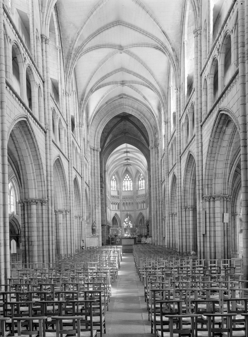 Cette nef frappe par son harmonie et son homogénéité qu’entame à peine une modification effectuée au XIVe siècle au niveau des trois dernières travées du collatéral sud. On a simplement à cet endroit ouvert le mur gouttereau, construit de nouvelles arcades dont les chapiteaux à corbeille bombée et le décor floral foisonnant se démarquent des modèles épurés du XIIIe siècle, et créé trois chapelles communicantes tout en laissant au revers de l’ancien mur les masses des contreforts contre lesquels ont alors été greffées des colonnettes supportant la retombée des voûtes des nouvelles chapelles. En face, dans le collatéral nord, trois enfeus installés aux XIVe et XVe siècles, abritent depuis le XIXe siècle des confessionnaux. L'élévation du transept, qui ne comporte que deux niveaux au lieu de trois, introduit une solution de continuité dans le parti architectural. Curieusement, en face des fenêtres gothiques percées à l’ouest, les murs orientaux des deux bras de transept sont aveugles et des baies plein cintre étroites, rappelant les baies romanes primitives, ouvrent sur les combles des premières chapelles du déambulatoire. La reconstruction dut commencer par le bras sud, sans doute vers la fin du XIVe ou dans les toutes premières années du XVe siècle. Il est certain que l'on a d'abord conçu des bras de transept non voûtés, simplement couverts d'une charpente lambrissée : la charpente à chevrons-fermes soignée, avec entraits et poinçons octogones, qui subsiste dans le bras nord et dont les entraits sont en partie noyés dans l'extrados des voûtes confirme cette hypothèse. La grande baie à rosace percée dans le pignon du bras sud qui monte plus haut que le sommet des murs gouttereaux, de même qu'une autre baie percée dans le mur ouest du même bras, à l'origine plus large que les actuelles travées de voûtes, apportent des arguments irréfutables en ce sens. Les armes de Christophe de Chavigné, évêque de 1521 à 1554, sur une des clefs de voûte du bras nord, celles de l’évêque Guy Leclerc (1514-1520) sur la troisième travée du mur est du bras sud, associées à la clef de la voûte centrale aux armes de l'évêque Jean de Carman (1503-1514), confirment une installation très tardive des voûtes dans les premières années du XVIe siècle, que L. Lécureux avait déjà observée. La fenêtre du pignon du bras nord, désaxée vers l’est à cause du collage contre l’angle nord-ouest du bras de transept d’un bâtiment de l’ancien palais épiscopal, fut recentrée lors des travaux de restauration en 1869.