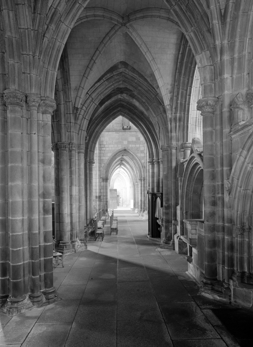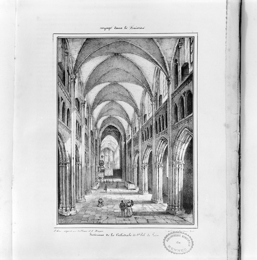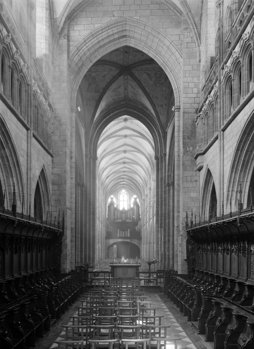 La nef de la cathédrale, édifiée à partir de la seconde moitié du XIIIe siècle, est un bel exemple d’architecture normande transposée en terre bretonne. A la différence de la façade et des tours, qui sont édifiés en granite, elle est entièrement bâtie en calcaire de Caen, importé par bateaux et débarqué dans l’ancien port voisin de Pempoul, à l’est de la ville. La travée d’entrée est délimitée par deux fortes piles fasciculées qui supportent la masse des tours. Les piles composées des grandes arcades présentent une ordonnance impeccable et rigoureuse. Le rouleau interne retombe sur une colonne plaquée contre un dosseret dont les angles sont retaillés par un cavet, les rouleaux externes retombant sur des colonnettes, les voûtes du côté de la nef comme du côté des collatéraux retombant sur un groupe de trois piles dont le diamètre n’excède pas celui des colonnettes intermédiaires. Avec un aspect décomposé, qui marque davantage les articulations, et une notable diminution du volume des piles qui reçoivent la retombée des voûtes, cette ordonnance est une transcription de celle des grandes arcades de la nef de Coutances. Les bases à galettes, les chapiteaux à quatre crochets, ou à feuilles stylisées repliées alternativement vers l’extérieur ou l’intérieur appartiennent également à la mouvance normande.La première travée, au droit des tours, présente une élévation à trois niveaux de type traditionnel : comme dans les modèles normands contemporains, les grandes arcades y sont surmontées d’un triforium à deux larges baies en tiers point soulignées par un tore et recoupées chacune en deux par une colonnette tandis qu’un passage au niveau des fenêtres hautes est flanqué de deux petites baies en arc outrepassé dont la hauteur s’arrête à l’appui de la fenêtre haute. A partir de la deuxième travée, sans qu'il soit avéré qu'il y eu véritablement interruption du chantier, ce parti d’élévation fut abandonné au profit d’un autre, adopté pour tout le reste de la nef. Dans cette nouvelle formule, le triforium, bordé par des frises de trilobes et de quadrilobes refouillés typiquement normandes, est constitué d’une claire-voie plus basse, à deux baies centrales encadrées par deux autres plus étroites. Cette solution originale qui aligne les baies latérales du triforium avec celles du passage au niveau des fenêtres hautes, relie plus fortement les parie hautes de l'élévation. Autre différence marquante, les colonnettes employées dans les arcatures du triforium de la première travée sont remplacées par des piédroits simplement chanfreinés dans lesquels des arcs à mouluration complexe viennent pénétrer directement selon une formule alors inédite en Bretagne, également employée pour les arcs segmentaires des portes du portail occidental. L’emploi des moulures à pénétration directe, emprunté lui aussi à l’architecture normande de la première moitié du XIIIe siècle, qui n’en fait toutefois qu’un usage ponctuel, est ici systématisé, probablement pour la première fois. Ce dépouillement relatif n’en sert que mieux la rythmique de l’élévation : des recherches semblables d’épuration de la modénature se retrouvent sensiblement à la même époque dans les élévations des chœurs de Dol et de Saint-Sauveur de Redon.