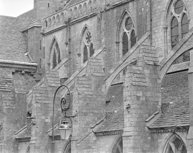 L'ensemble du chevet offre le contraste entre l'échelonnement à redents des chapelles ponctué par la chapelle d'axe plus volumineuse que les autres, plan qui rappelle les églises d'outre-Manche, et l'étage des fenêtres hautes avec son abside à trois pans conforme au modèle gothique français. Cette mixité se retrouve, dans un sens inverse, au niveau du style puisque les fenêtres hautes du chœur ont une découpe en mitre fortement accentuée si typiquement anglaise, tandis que celles des chapelles adoptent une forme en tiers point conforme aux modèles français.