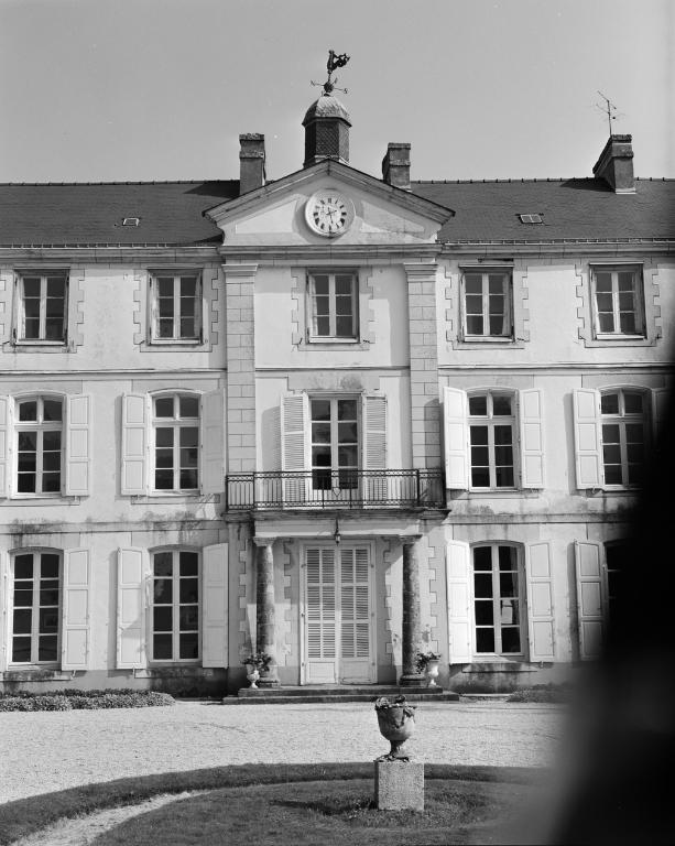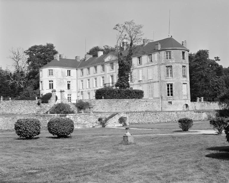 Logis à plan en L ; corps principal enduit à deux étages carrés toit à longs pans terminés par une croupe ronde au sud, noue au nord, escalier tournant à retours avec jour ; corps en retour enduit à deux étages carrés, toit à longs pans, croupe ronde à l'ouest, noue à l'est ; maison de gardien enduit, un étage carré, toit à longs pans, croupe ; écuries enduites, comble à surcroît, toit à longs pans, croupe ; chenil, pigeonnier en moellon et brique, toit à longs pans, appentis, toit en pavillon. Plan allongé, plan en équerre, 9 travées, avant corps, cheminée sur goutterot.