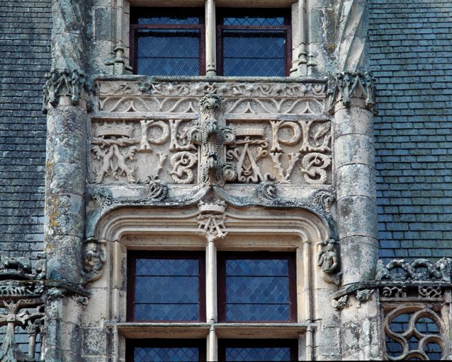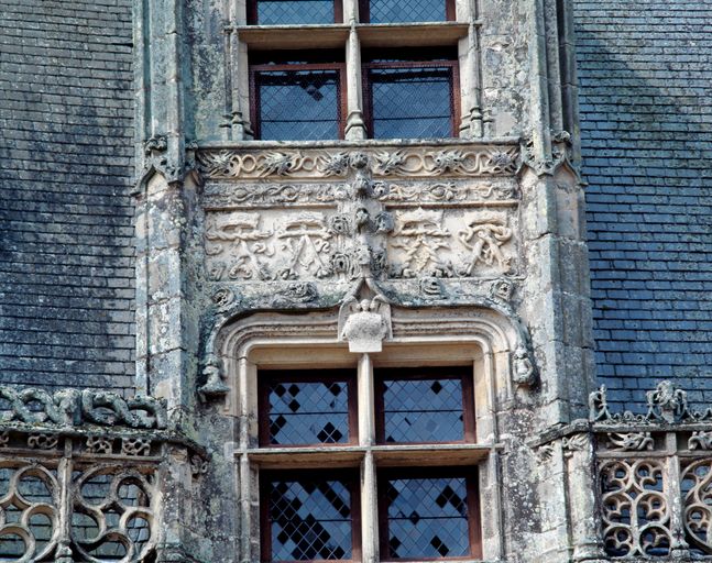 Sujet : personnages profanes affrontés, support : élévation antérieure ; sujet : ornement, entrelacs, monogramme AM, couronne, armoiries, support : élévation antérieure, lucarnes. Sujet : scène de chasse, vigne, animal fabuleux, couronne, support : rez-de-chaussée, cheminée ; armes des Rohan et des familles apparentées, devise a plus, support : cheminées et lucarnes.