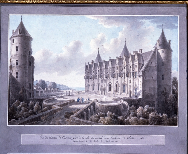 Vue du château de Josselin prise de la salle du conseil dans l'intérieur du château appartenant à M. le duc de Rohan. Aquarelle, [s.l. ; s.n. ; 18e siècle].