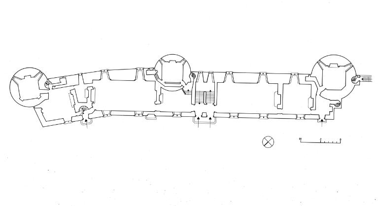 Escalier principal, plan au sol et coupe transversale. Relevé par Jean BLÉCON. In : GUILLAUME, Jean. L'escalier dans l'architecture de la Renaissance. Paris : Editions Picard, 1985.
