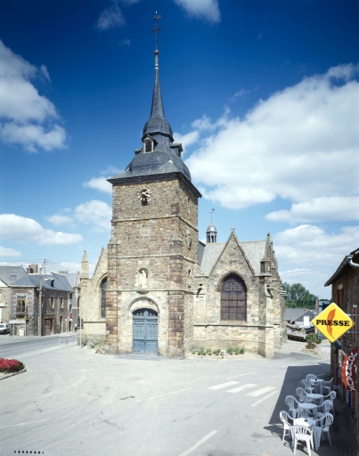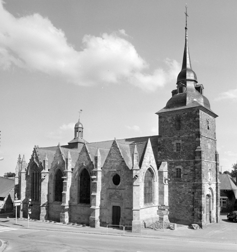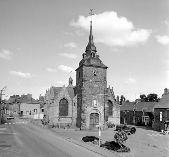 Eglise donnée à l'abbaye Saint-Melaine par Alain, évêque de Rennes, au milieu du 12e siècle. Un caveau (ou une crypte) découvert en 1775 et resté fermé depuis, possède un accès dans le mur nord du choeur. Des vestiges du 15e siècle sont également à signaler : chapelle seigneuriale avec cheminée au nord du choeur (fragments d'un retable gothique dans le mur est du bras nord) et portail occidental remonté dans la tour du 18e siècle. La nef a été construite entre 1536 et 1546 par Richard Babin, les trois chapelles nord entre 1551 et 1562 sur les plans et devis de Jean Coury et Jean Perdriel. Le collatéral sud est reconstruit en 1759 1760 par Antoine Forestier le jeune, architecte rennais, dans le style local à pignons multiples. La tour ouest date de la même campagne de construction. Ces travaux ont entraîné la démolition de la chapelle Saint-Nicolas, dite chapelle Sauldecourt, de la chapelle de la confrérie Notre-Dame-de-Pitié, du porche sud et d'un édifice servant de sacristie. Au 20e siècle, on supprime le cimetière et on dessine le tracé de l'actuelle D 777 au ras de l'édifice.