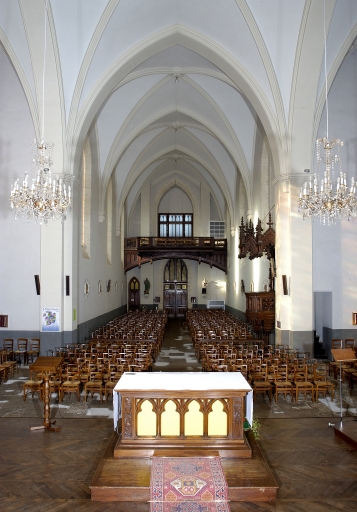 Plan en croix latine, nef à 1 vaisseau, fausse voûte d'ogives. Type de couverture : toit à longs pans, noue, croupe, appentis, pignon découvert, flèche en maçonnerie. Typologie : style néo-gothique ; clocher-porche ; chevet à pans coupés.