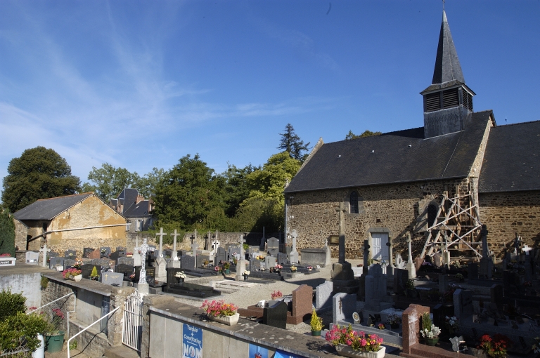De l'ancienne église priorale fondée au 12e siècle, qui appartenait à l'abbaye Saint-Melaine de Rennes, subsistent la structure à arc triomphal et d'importants vestiges. Des travaux sont à signaler dans la 2e moitié du 18e siècle : agrandissement des baies de la nef et du choeur, reprise partielle de l'élévation occidentale portant la date 1770, construction d'un chevet droit vers 1780 à la demande du recteur Julien Piette. Le clocher est reconstruit en 1833.