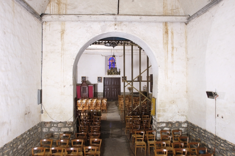 Plan allongé, lambris de couvrement, clocher en haut de nef, arc diaphragme, chevet plat.