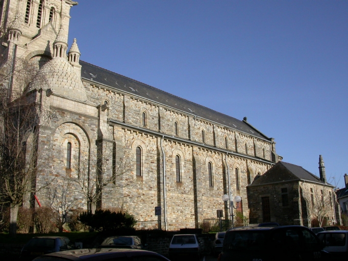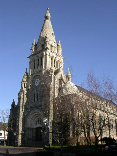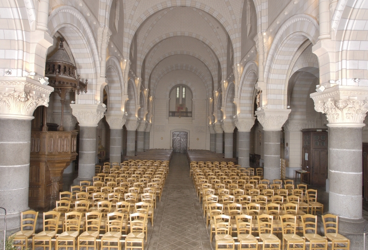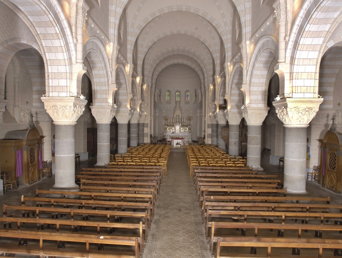 Eglise de plan allongé, de type basilical avec prépondérance de la nef centrale. Le choeur est terminé par une abside. Style néo roman. A noter les couvertures en pierre dans le style médiéval « à écailles ».