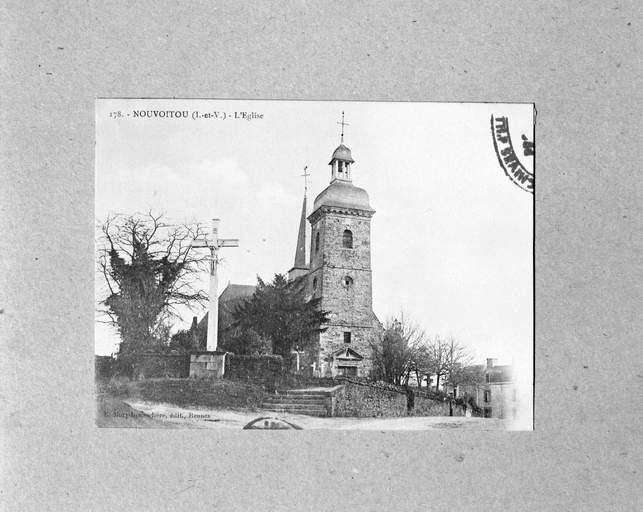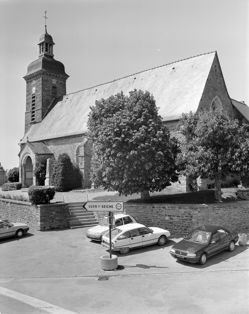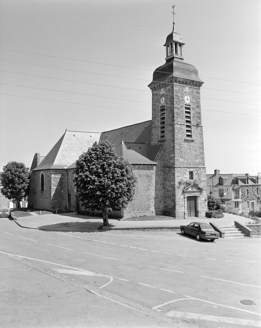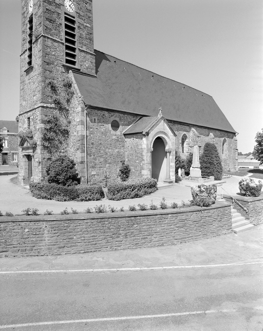 Choeur reconstruit en 1486 (inscription gravée sur une dalle d'ardoise : MIL QUATRE CENS QUATRE VINGT SIX, POUR LE PROUFILT DES MORS ET DES VIFS FUT REFAICT TOUT- DE NOUVEAU, L'EDIFICE DE CEST CHANCEAU LORS THESAURIERS ESTOIENT POUR VOIR GILL ET MAULGENDRE ET JEHAN MAULNOIR) . Bas-côté et tour du 17e siècle. Porche latéral du 19e siècle avec remplois d'éléments du 16e siècle. Croix probablement du 16e siècle, dans l'enclos.