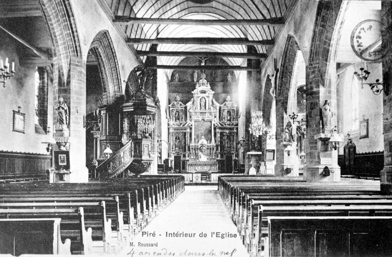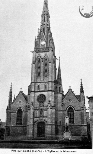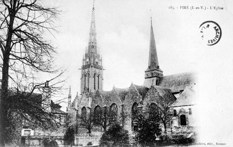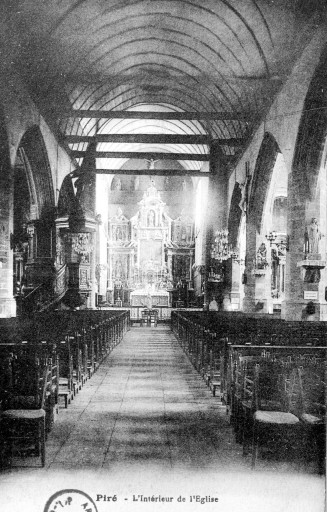 Eglise attestée au 12e siècle. Nef accostée d'un bas-côté au nord, construit entre 1540 et 1549 (date de la consécration par l'évêque de Rennes), et d'un bas-côté au sud, construit entre 1603 et 1605 (dates portées). Inscription sur la porte sud : ESTANT NOBLE ET DISCRET PRESTRE : RENE DE L'ESPINAY RECTEUR DE PIRE : SIEUR DE LA GUAYE FUT CESTE EDIF : CE COMMENCE. SA (NC) TE DEUS SA (NC) TE FORTIS SA (NC) TE IMORTALIS MISERERE NOBIS SA (NC) TE PETRE ORA P (RO) NOBIS : TOUT EST A Dieu 1603. Le choeur fut reconstruit d'abord en 1627, surmonté alors d'un dôme foudroyé en 1741, puis de nouveau entre 1752 et 1775, accolé de sacristies latérales. Clocher en haut de nef reconstruit en 1669. En 1874, l'architecte Aristide Tourneux fait procéder à l'ajout d'une travée au nord de la nef et à la construction d'un clocher-porche surmonté d'une flèche. Vitraux signés et datés : Claudius Lavergne 1882, et également vitraux des ateliers Rault et du Carmel du Mans. Mur sud de l'enclos refait au 19e siècle avec escalier monumental d'angle.