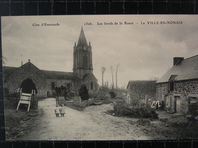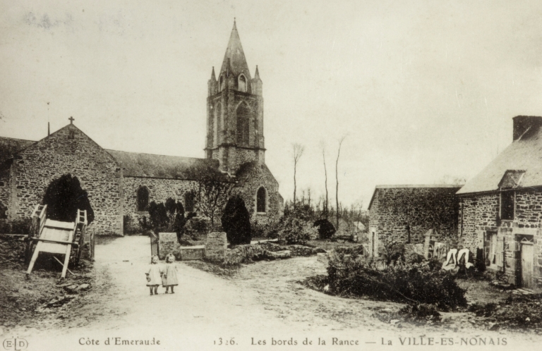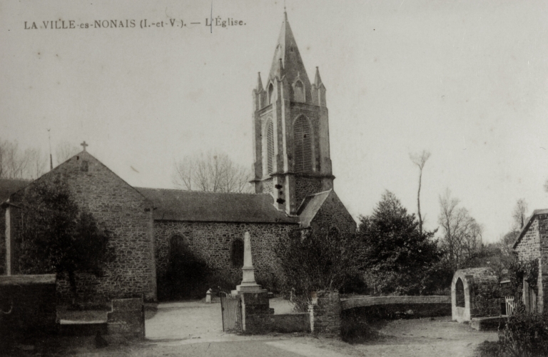 Au 12e siècle il existait une chapelle priorale dépendant de l'abbaye de Saint-Sulpice-des-Bois. Cette chapelle devint frairienne en 1621. La Ville-es-Nonais fut érigée en paroisse en 1847. L'église actuelle a été construite par l'architecte Hawke aidé de l'entrepreneur Postel de Pleudihen de 1846 date du début des travaux, à 1854 date de sa bénédiction par Mgr Brossais Saint-Marc. Elle a conservé son enclos paroissial ainsi que son environnement qui contribue au charme de cet endroit. L'extérieur homogène témoigne également d'une mise en oeuvre sobre de qualité qui rend compte de l'architecture néogothique de cette période.
