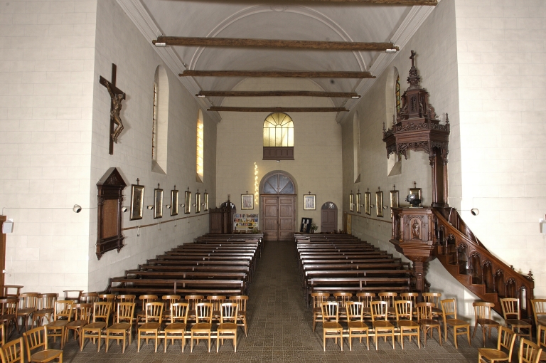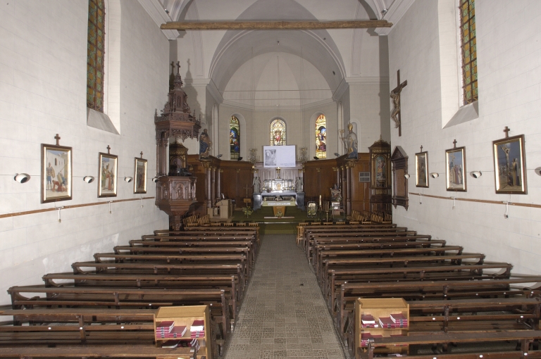 Plan en croix latine, lambris de couvrement, clocher en façade, chevet à pans coupés ; toit à longs pans ; noue ; croupe polygonale.