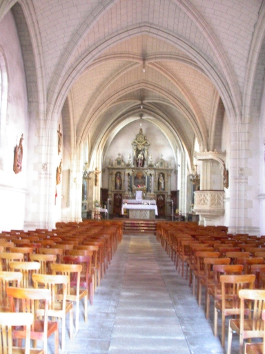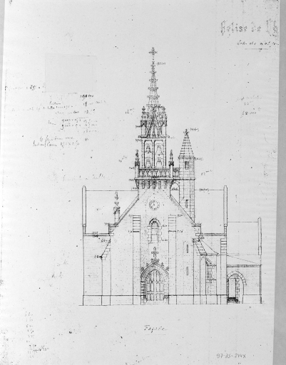 Plan en croix latine, chevet plat, clocher en façade. Style gothique flamboyant.