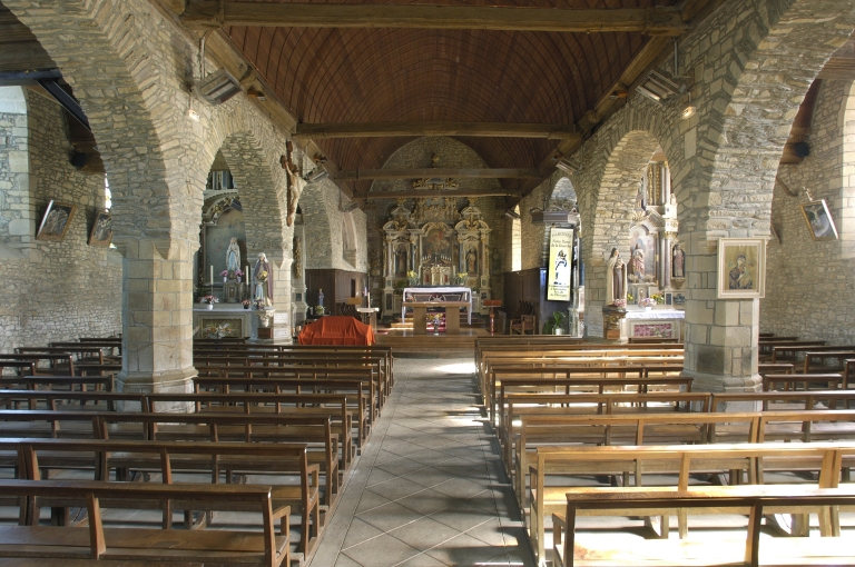 3 vaisseaux, plan allongé, lambris de couvrement, clocher latéral accolé à la façade principale, façade latérale à pignons multiples, sacristie à étage, chevet plat.