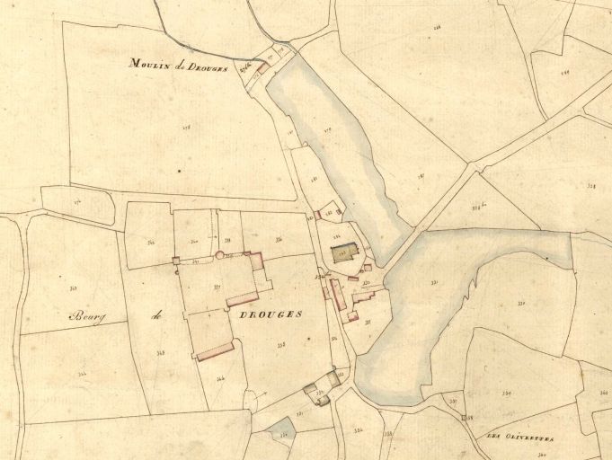 Selon les recherches faites par l´abbé Guillotin de Corson, la paroisse de Drouges n´apparaît dans les sources qu´au 15e siècle, mais selon lui elle devait être plus ancienne. L´église dédiée à saint Pierre a été reconstruite au 16e siècle et quelque peu modifiée au 18e siècle dans le bas côté nord. Elle est composée de trois vaisseaux. Les bas côtés forment à l´extérieur une succession de pignons, quatre au sud et trois au nord réalisés selon le modèle proche de la Collégiale de Notre Dame de la Guerche. La construction à la fin du 15e siècle des bas côtés de la collégiale a servi de modèle à un certain nombres d´églises rurales du canton. Ceux de l´église de Drouges moins ornés ne possèdent pas de décor, hormis la simple croix de couronnement placée au-dessus de chaque pignon. Le seigneur de la Guerche était seigneur supérieur et fondateur de l´église de Drouges, où il avait toutes les prééminences. Les ducs de Brissac, seigneurs de la Guerche, du milieu du 16e siècle au milieu du 17e siècle, possédaient une litre extérieure et intérieure à leurs armes. En 1685, le duc de Villeroy devenu seigneur de la Guerche prit possession de l´église, un acte de cette époque rapporte qu´à cette date, on y remarquait dans le choeur, au-dessus du maître autel, les écussons du duc de Brissac, mais aussi ceux de Jean-Jacques de Rihouart, seigneur de Villayes. Le cimetière entoure toujours l´église, l´enclos paroissial a été refait au 19e siècle. (A signaler également les retables du 17e siècle, voir patrimoine mobilier de l´église).
