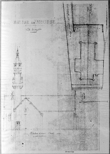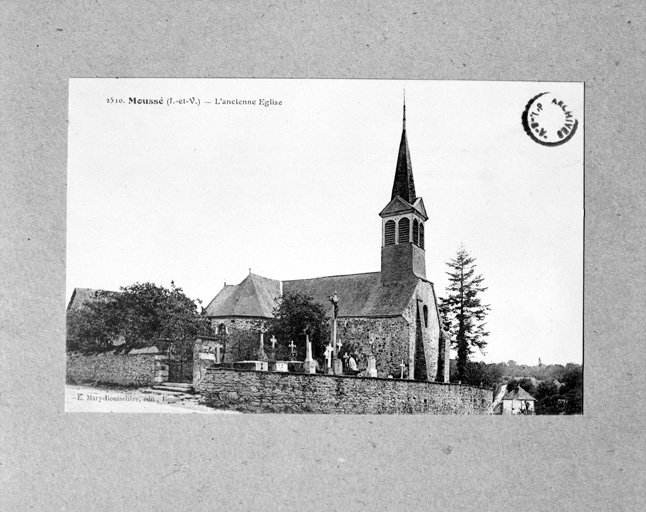 "Il n'y avait d'intéressant, dans l'ancienne église, qu'un vieil autel en pierre qu'on a transporté dans la nouvelle." Ici, comme à Coësmes A. Regnault part d'un élément existant pour concevoir un édifice à vaisseau unique couvert d'un lambris avec un choeur d'une travée droite voûté d'ogives. Le clocher, inspiré de celui de N.D. de Croas-Batz à Roscoff offre une silhouette évocatrice dont l'enjeu politique est bien perçu par le clergé. L'architecte a eu l'heureuse idée de donner au clocher de Moussé un caractère franchement bas-breton ainsi qu'aux clochers de la Guerche et de Chelun, tous situés dans les limites de la province.