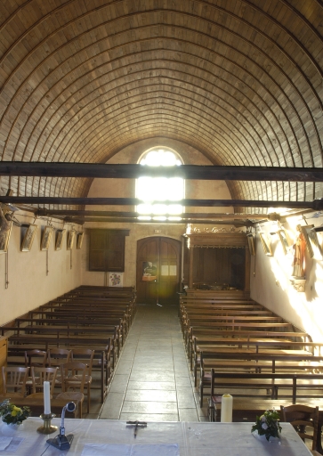 Plan en croix latine, lambris de couvrement, voûte d' ogives, clocher latéral avec chambre des cloches ajourée, chevet plat, style néo-renaissance.