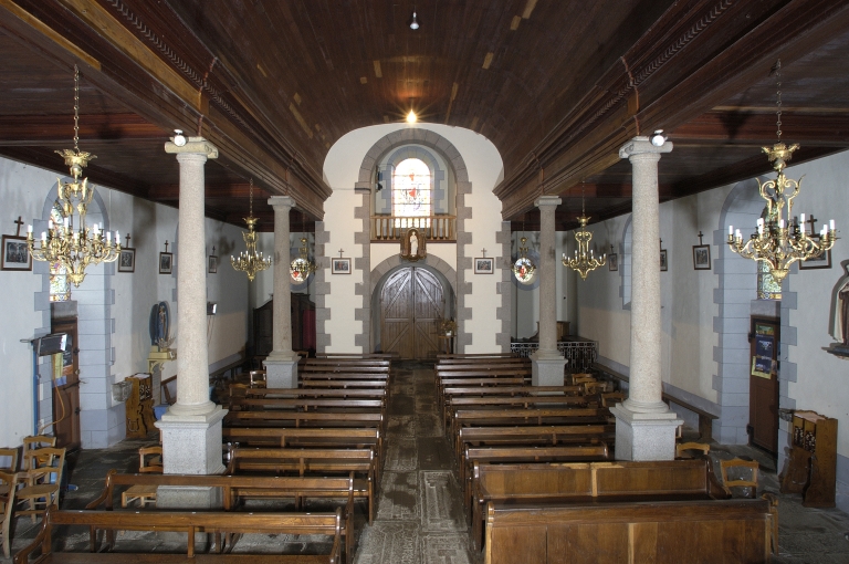 Plan allongé à trois vaisseaux ; lambris de couvrement ; clocher en bas de nef, chevet plat, sacristie accolée au chevet ; toit à longs pans, pignon couvert, flèche polygonale.
