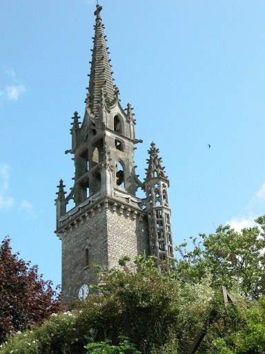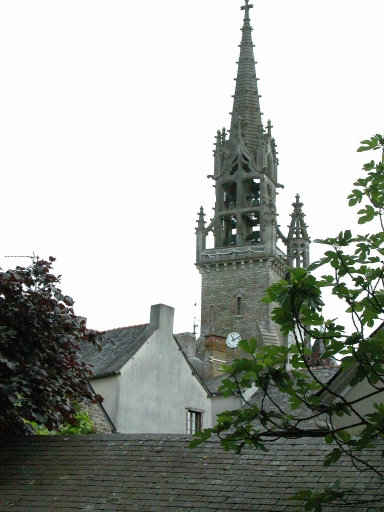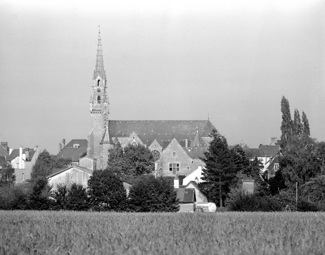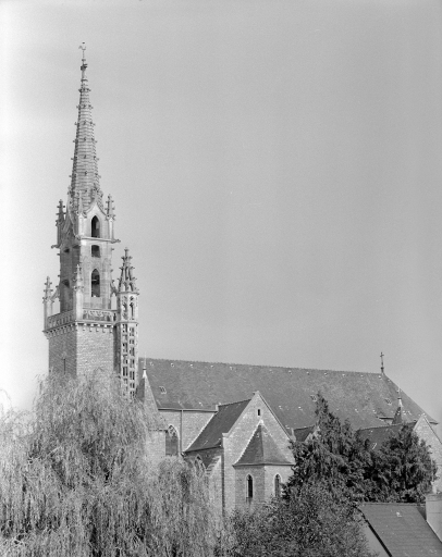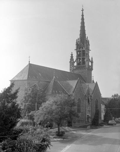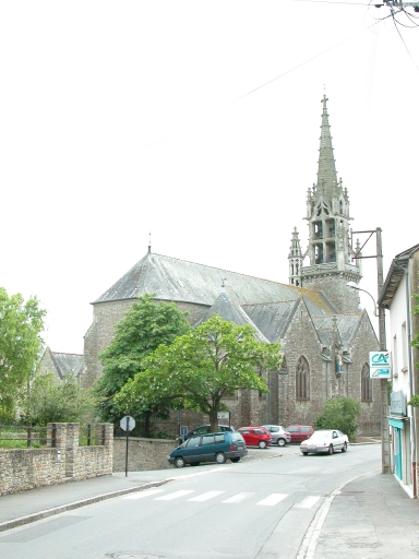 Ancienne église mentionnée dès 1160 et relevée aux 16e et 17e siècles (ancienne tour datée 1582). Eglise actuelle entièrement édifiée sur les plans d'Arthur Regnault en 1904 (date et attribution par source). Il utilise le modèle de la voûte bombée dite Plantagenêt pour le couvrement de la nef et des bas-côtés, par contre pour le clocher, il s'inspire des clochers-murs cornouaillais. Deux fenêtres de la limite du 15e siècle et du 16e siècle de l'ancienne église ont été remployées au sud de la nef. Cette église reconstruite dans le style flamboyant breton est représentative du style de l´architecte à cette période.