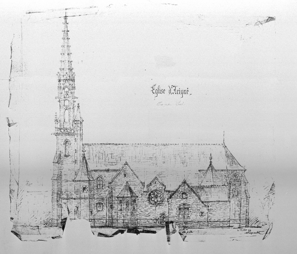 Acigné, église paroissiale, élévation de la façade sud. Dessin n° 3 bis, crayon papier sur calque, signé A. Regnault, 20 juillet 1899. (A.D. Ille-et-Vilaine).