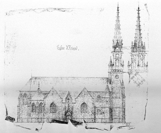 Acigné, église paroissiale, élévation de la façade nord. Dessin n° 5 bis, crayon papier sur calque, signé A. Regnault, 22 juillet 1899. (A.D. Ille-et-Vilaine).