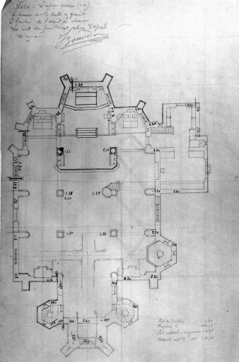 Acigné, ancienne église paroissiale, plan des fouilles. Plan, crayon papier et encre de chine sur calque, signé J. Bourdon, [s.d.]. (A.D. Ille-et-Vilaine).