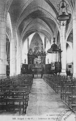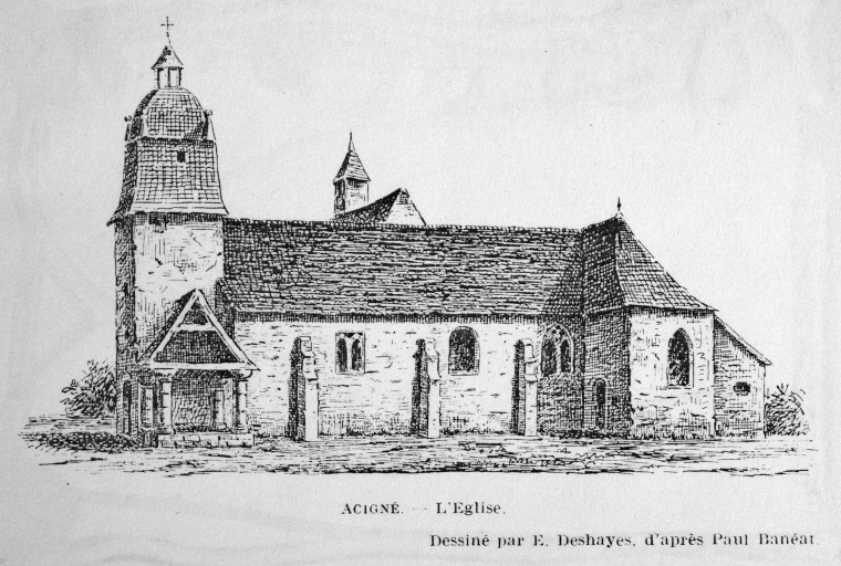 Acigné. - L'Eglise. Dessin de E. Deshayes, d'après Paul Banéat. In : BANÉAT, Paul. Le département d'Ille-et-Vilaine. Histoire, Archéologie, Monuments. Rennes : J. Larcher, 1927.
