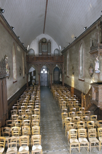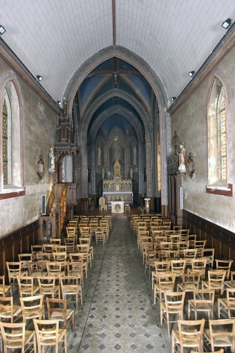 Plan en croix latine.1 vaisseau. Chevet plat avec niche à jour céleste. Sacristie accolée contre le chevet. Clocher porche. Style néogothique.
