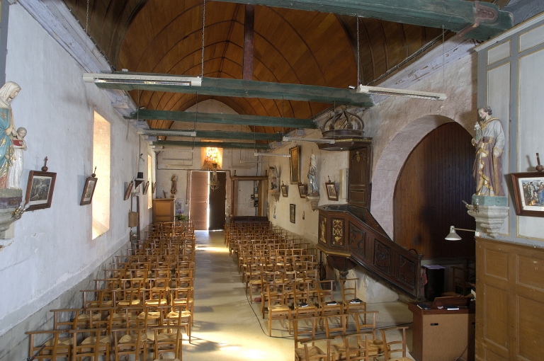 Plan allongé, nef unique terminé par un chevet plat. Clocher latéral nord. Porche latéral au sud. Intérieur avec charpente et lambris de couvrement.