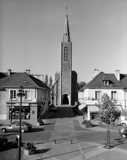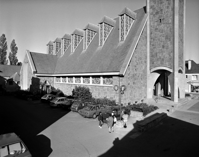 L'ancienne église datait principalement du 16e siècle, elle comprenait une nef à chevet droit et un transept ainsi qu'une tour carrée devant le pignon ouest. A partir de celle-ci, avait été construit de 1877 à 1884 un nouvel édifice suivant les plans de l'architecte Crespel (date et attribution par travaux historiques) . Bombardé lors de la dernière guerre, il a été remplacé par l'église actuelle construite en 1950 par l'architecte Chouinard.