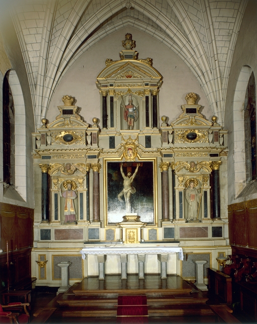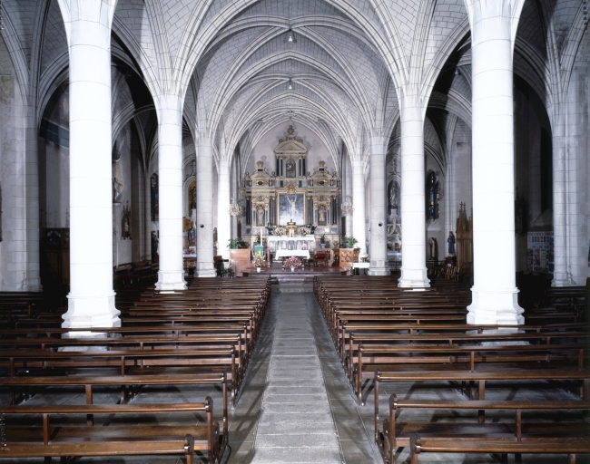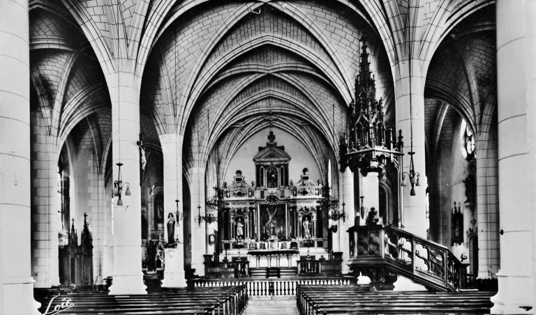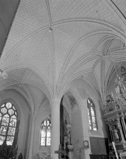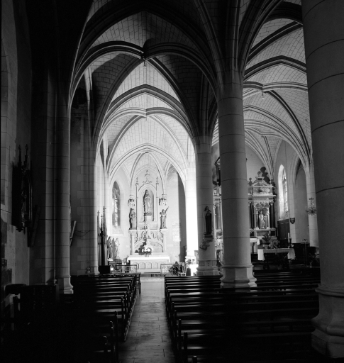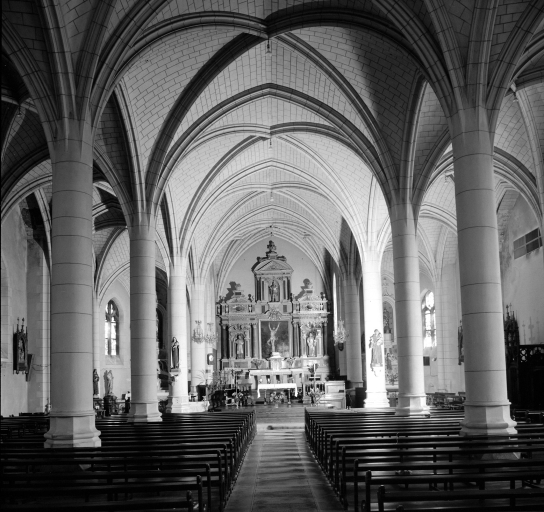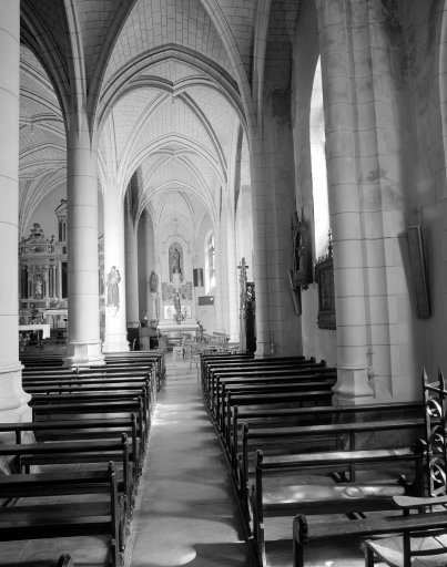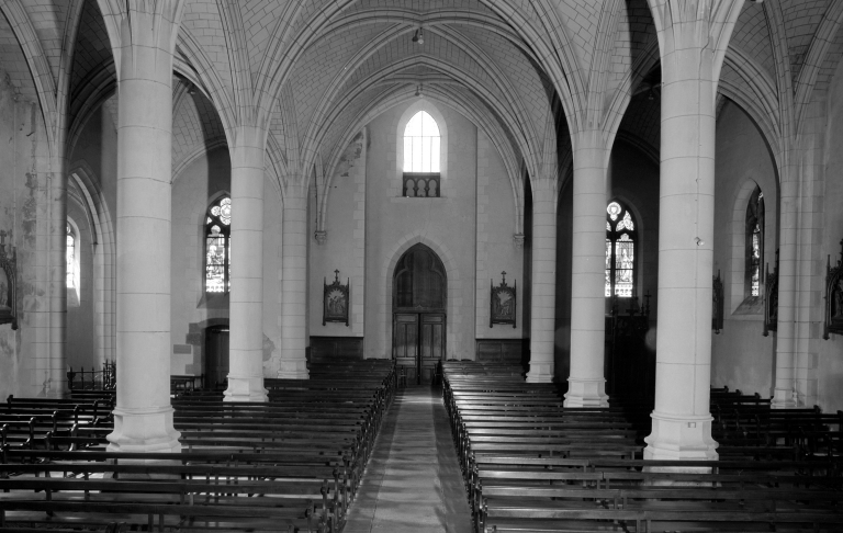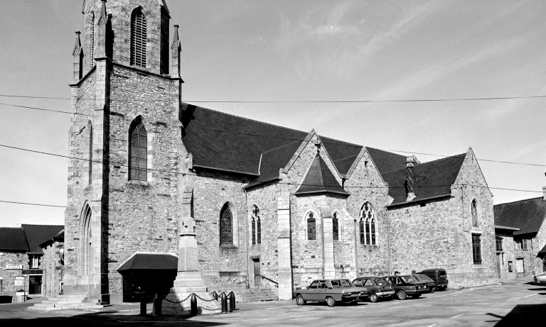 Eglise de plan en croix latine à trois vaisseaux. Gros oeuvre en moellon de grès ou de quartzite. Contreforts, baies, rampants, chaines et plinthe en pierre de taille de granite. Colonne et nervures des voûtes en tuffeau. Couvrement en voûtes d'ogives barlongues. Contrebutement latéral par des contreforts intérieurs. Chevet plat. Clocher-porche occidental hors oeuvre. Sacristie hors oeuvre dans l'angle sud-est. Chapelle des fonts demi-hors oeuvre à la hauteur de la 2e travée sud.